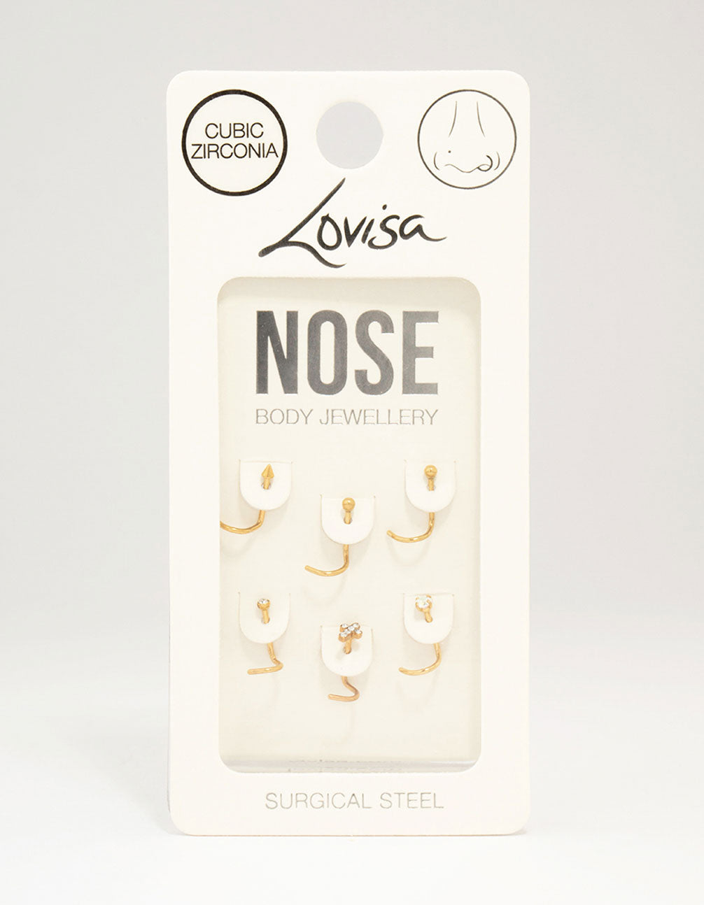 Customise your nose piercing with our selection of premium, surgical steel piercing jewellery. This nose piercing pack includes six individual piercings, each crafted from genuine surgical steel and plated with real gold for a premium touch.