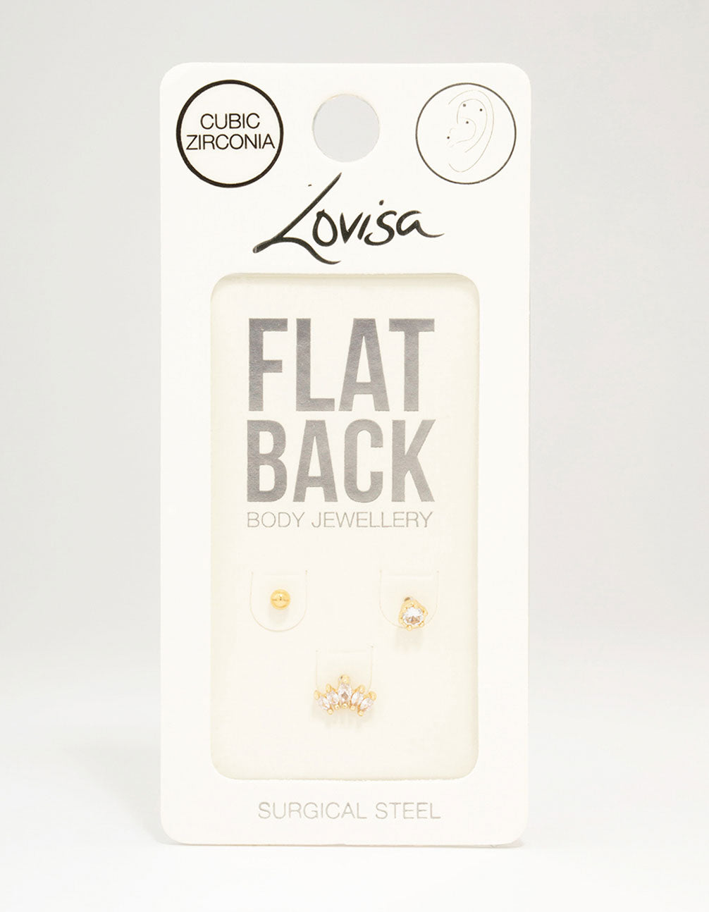 Personalise your stack with our selection of premium, surgical steel piercing jewellery. This flat back pack contains three individual, gold plated piercings. Each adorned with cubic zirconia crystals for a touch of glamour!
