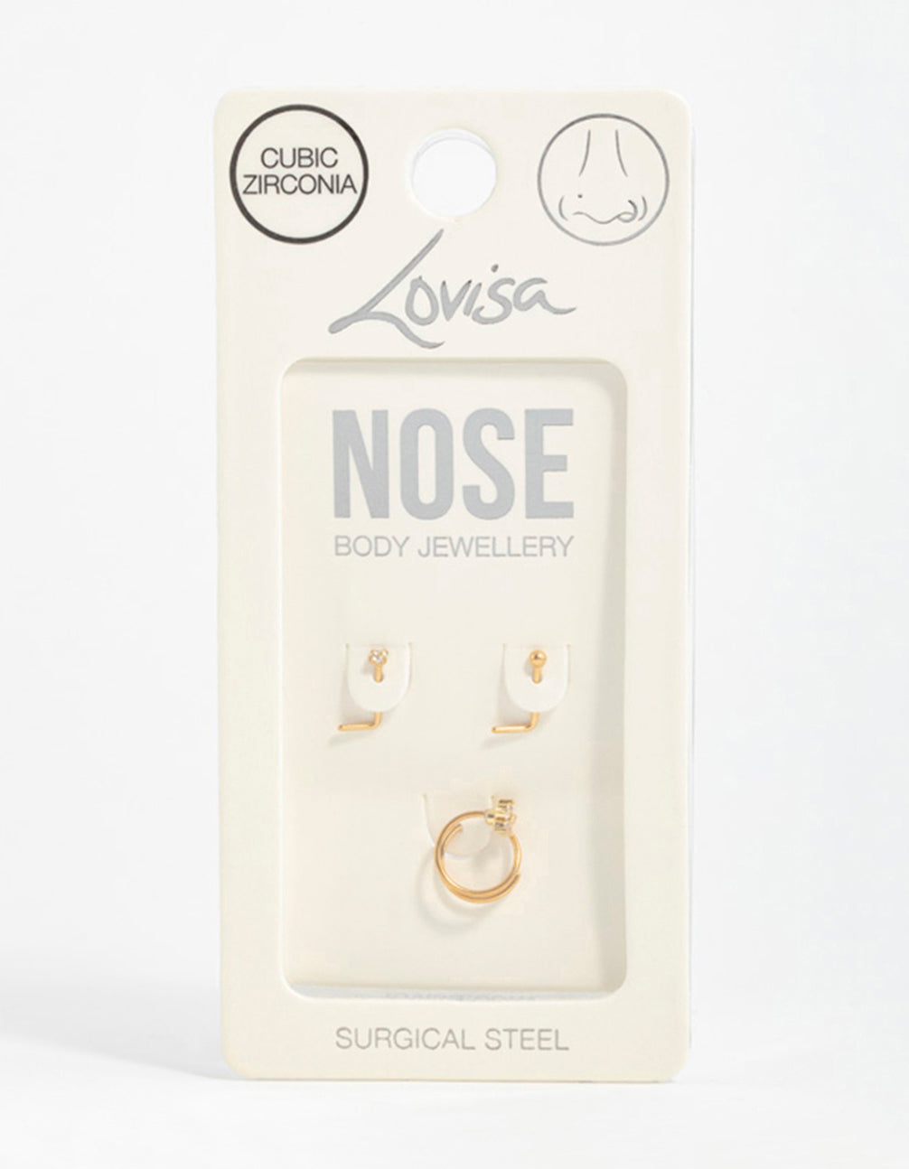 Upgrade your nose bling with this pack. This 3-pack includes a gold-plated spiral ring with cubic zirconia flowers, a classic cubic zirconia stud, and a sleek gold-toned stud. Perfect for any occasion, gentle on the skin, and effortlessly chic.