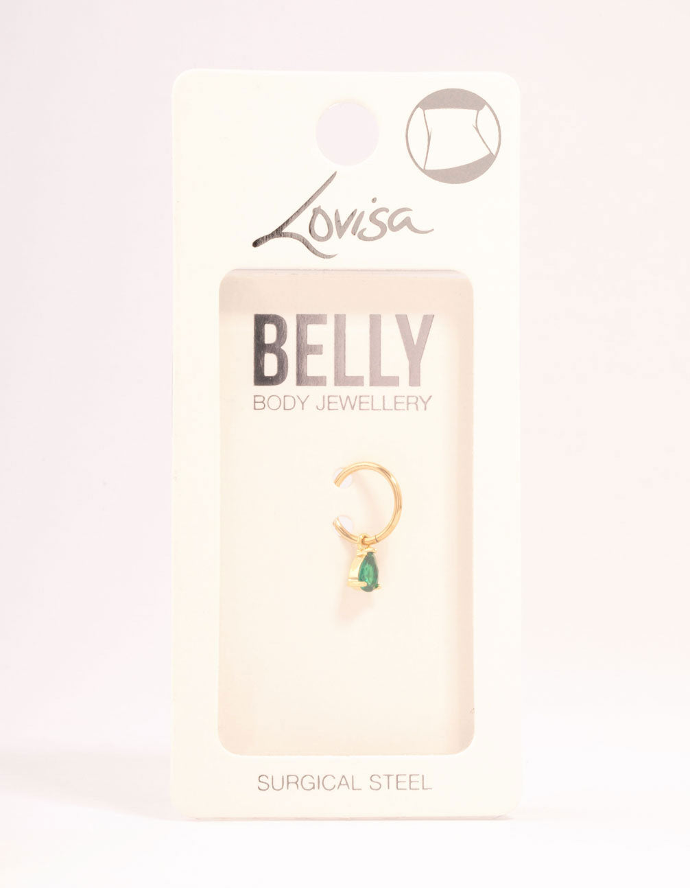 Gold Plated Surgical Steel Pear Green Diamante Drop Belly Bar
