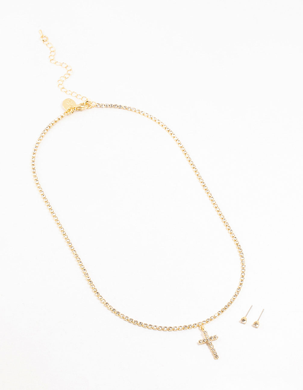 Gold Plated Tennis Cross Necklace & Stud Earrings Set