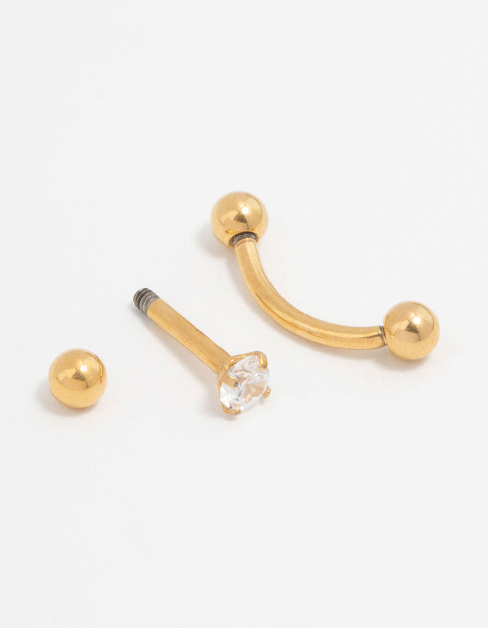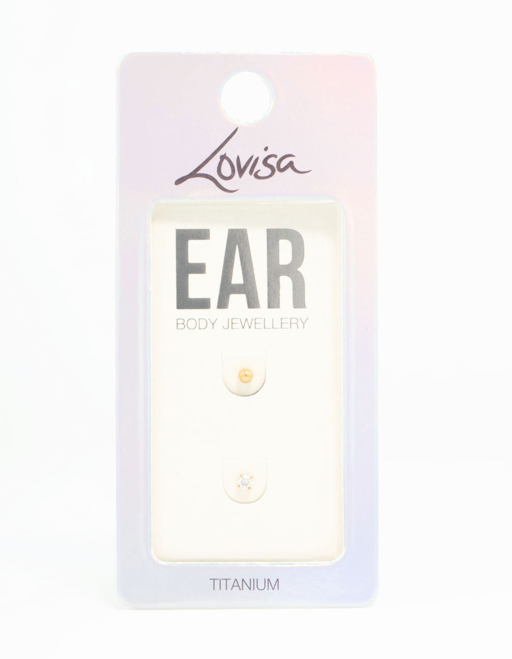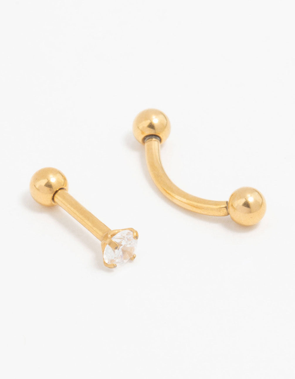 Upgrade your ear game with this duo of gold-plated titanium barbells! Choose between a sleek ball design or a sparkly cubic zirconia. Perfect for industrial or helix piercings, this set has you covered for any look.