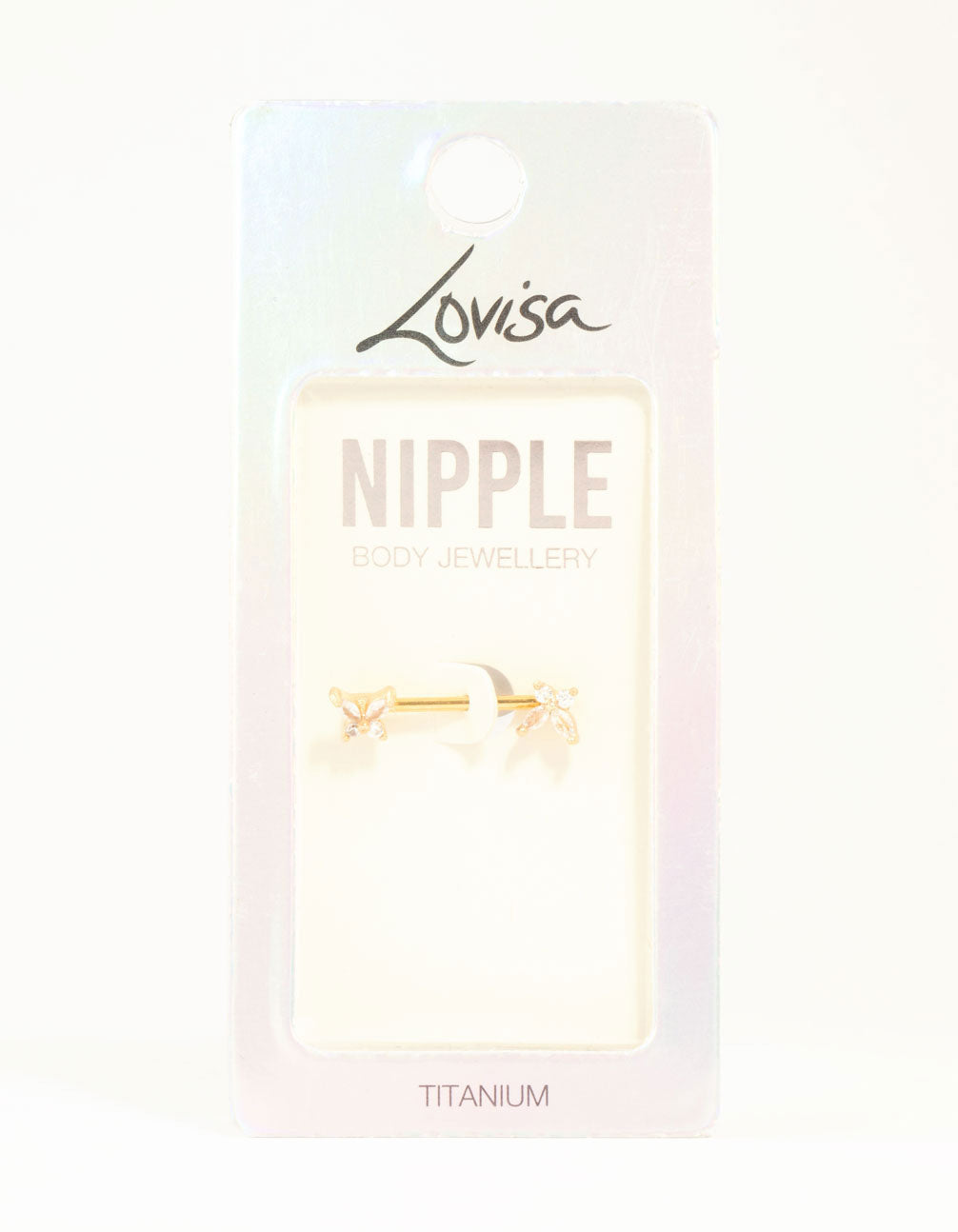 Add some sparkle with this gold-plated titanium nipple bar! The whimsical cubic zirconia crystal butterfly design adds a fun touch, perfect for pairing with your favourite lingerie or underneath a chic crop top.