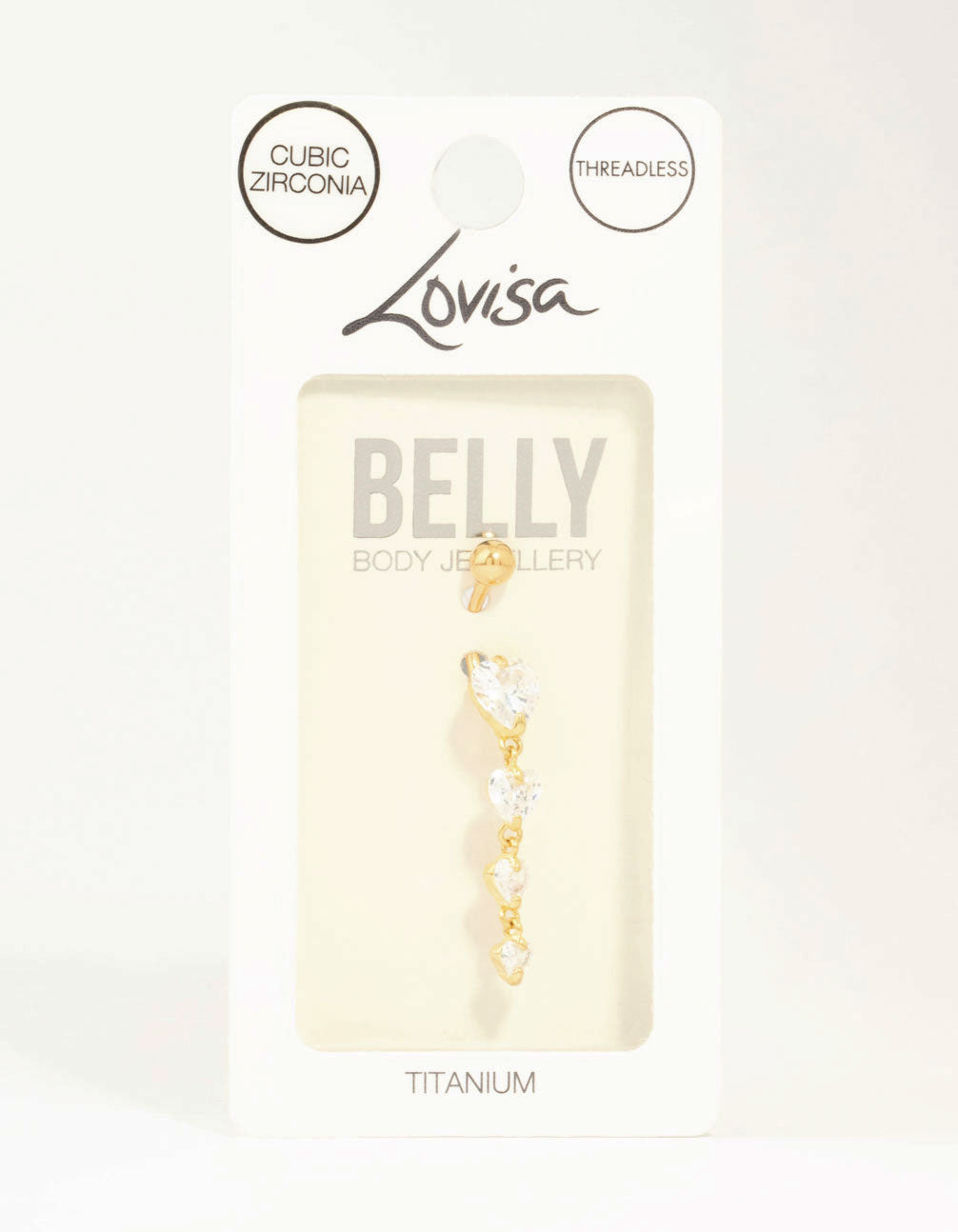 This belly bar features heart-shaped cubic zirconia crystals for a touch of playful shimmer. Made from titanium with gold plating, it's durable, hypoallergenic and shiny. Plus the threadless style makes it great for secure all day wear and easy to take out if needed.