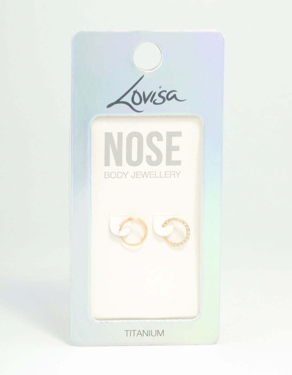 This fun nose piercing pack includes two stunning nose rings. Crafted from gold plated titanium and featuring a spiral design and cubic zirconia crystal accents, these nose piercings are durable and lightweight, ensuring comfortable wear all day.