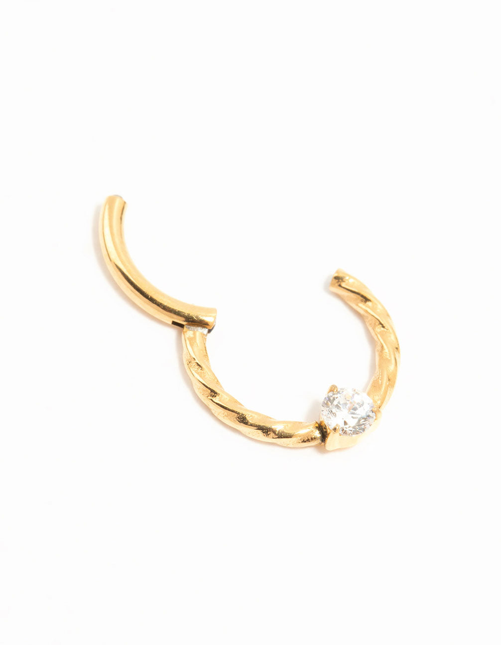 Get ready to rock your ear game with this clicker ring. This gold-plated twist clicker ring is perfect for cartilage piercings and adds a touch of glamour with its sparkling cubic zirconia crystal center.