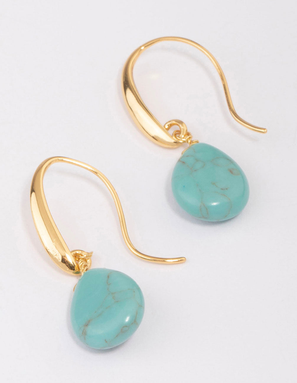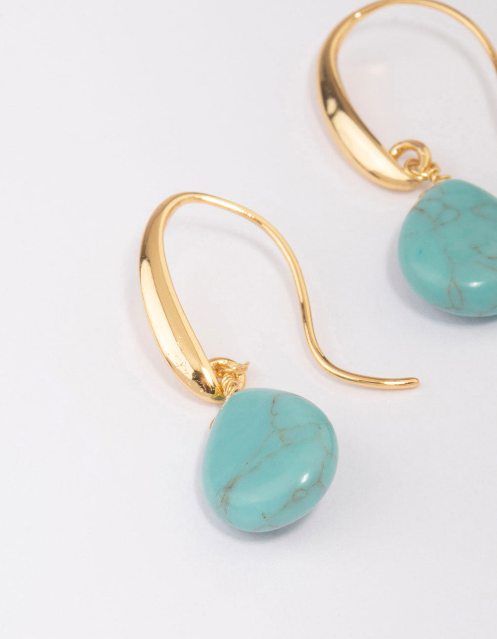 These simple drop earrings are plated with real gold and feature round, turqouise stones.