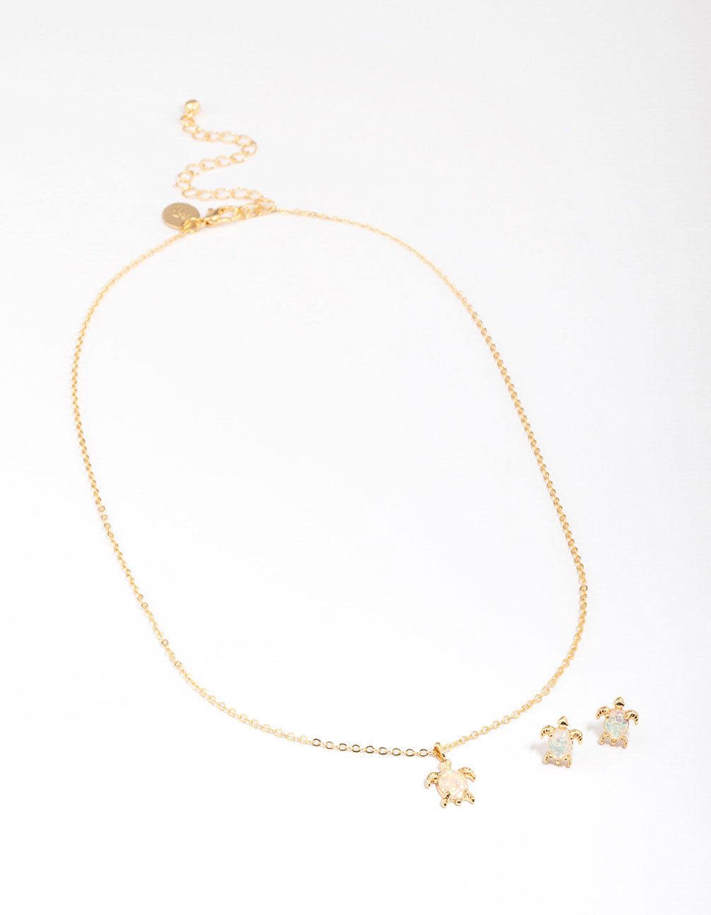 Complete your look with this premium, gold plated jewellery set. This matching set contains a fine chain pendant necklace and set of studs, both designed with semi-precious stones in the shape of a turtle.