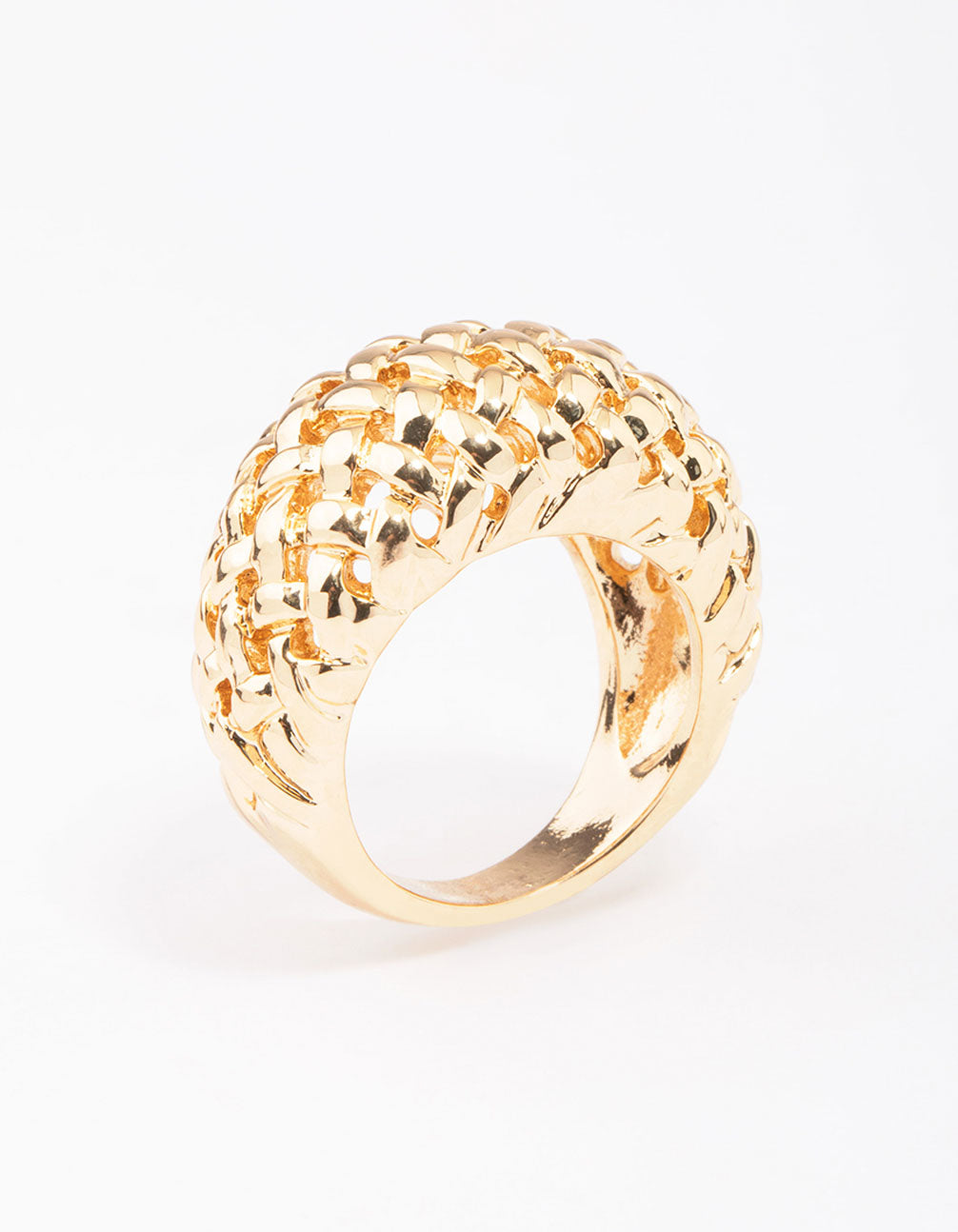 For a textural touch, style this gold plated ring. This cocktail ring features a dome-shaped silhouette and cross-hatch, woven design. Perfect for adding detail and dimension to your look!