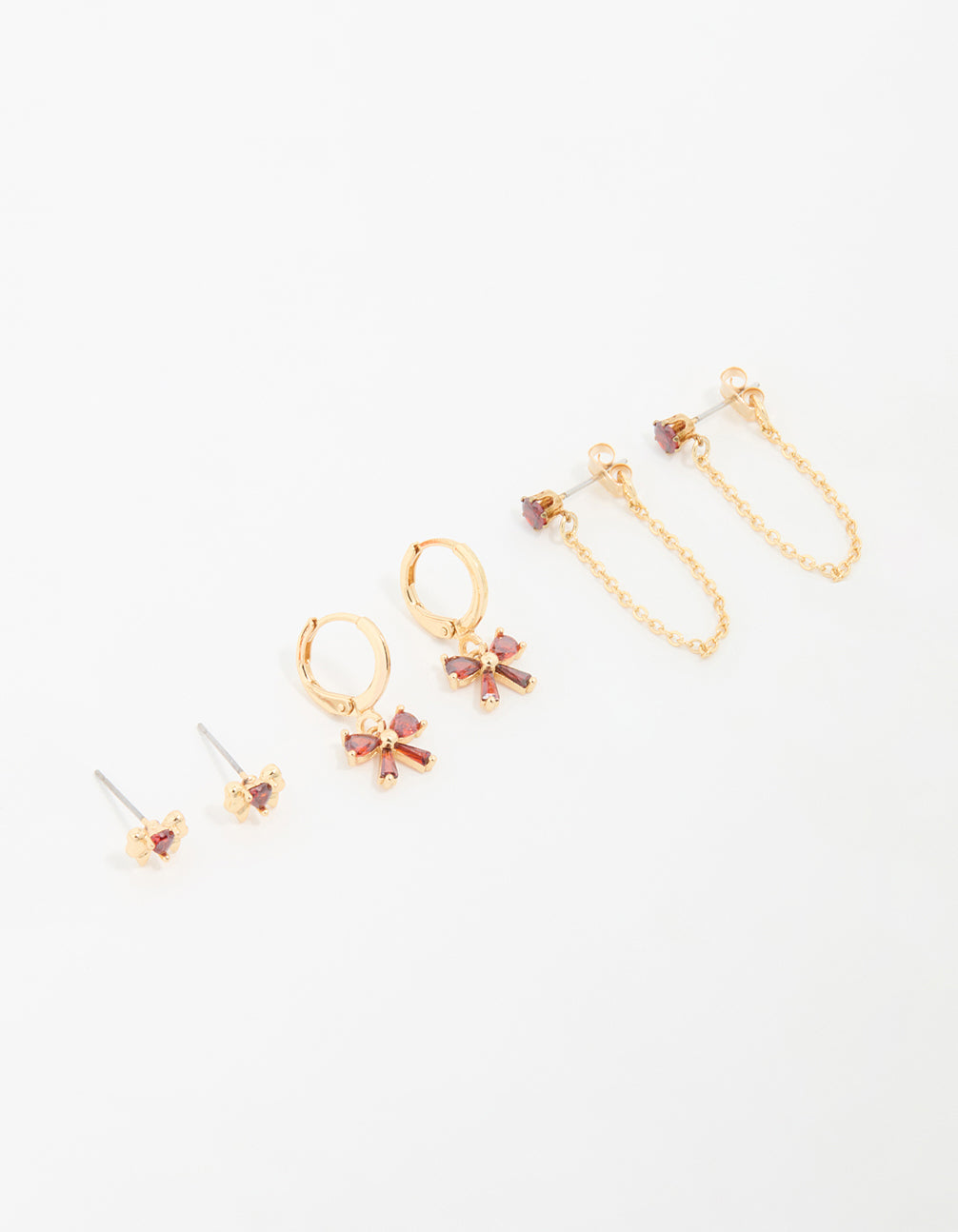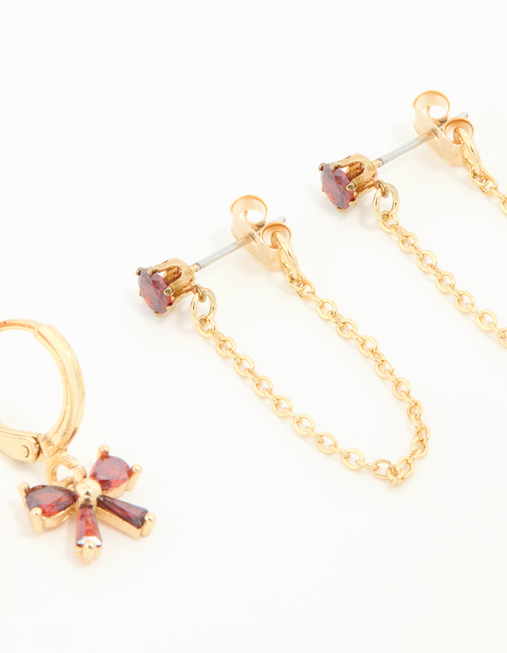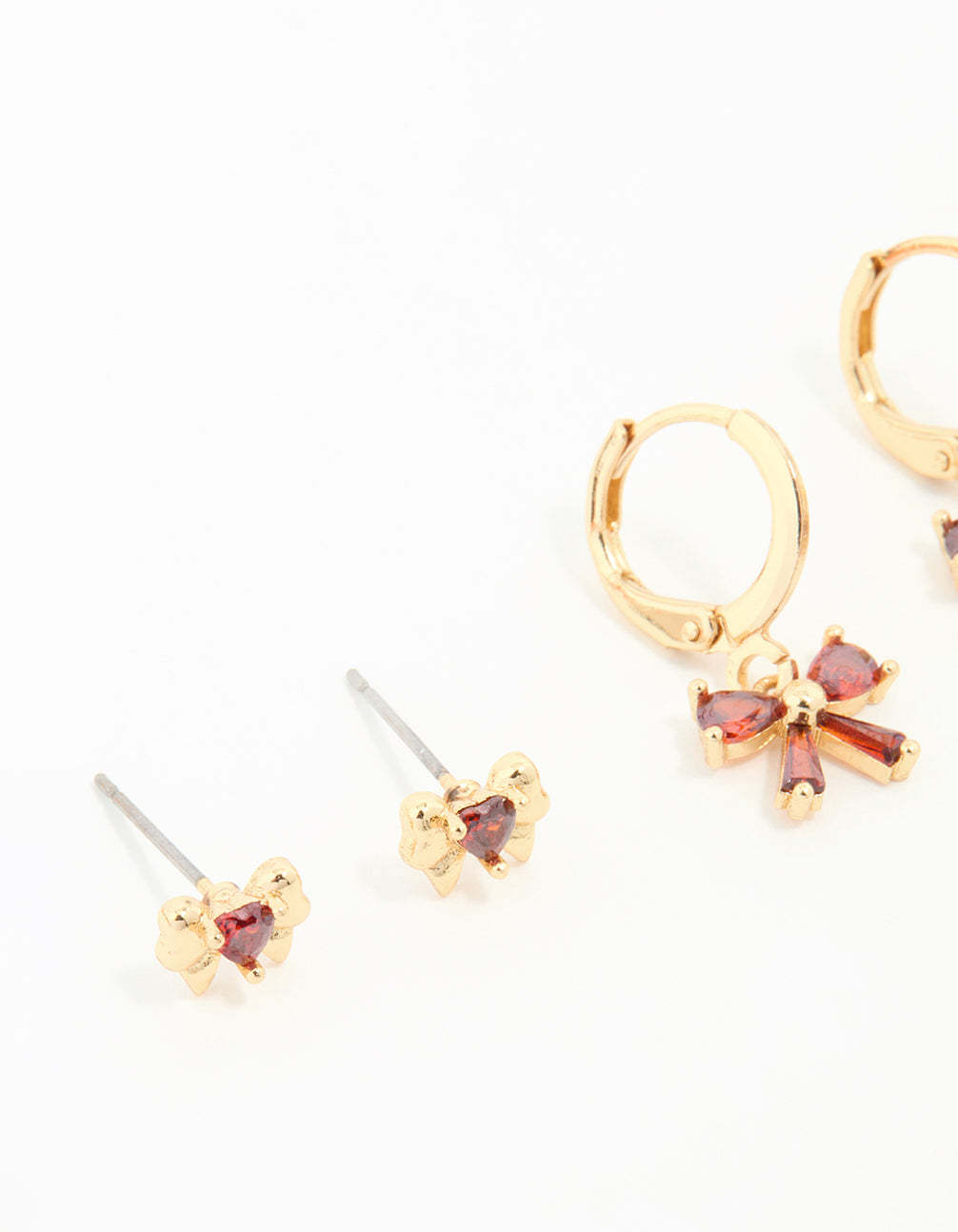 Gold Plated Red Cubic Zirconia Bow Huggie Earrings 3-Pack
