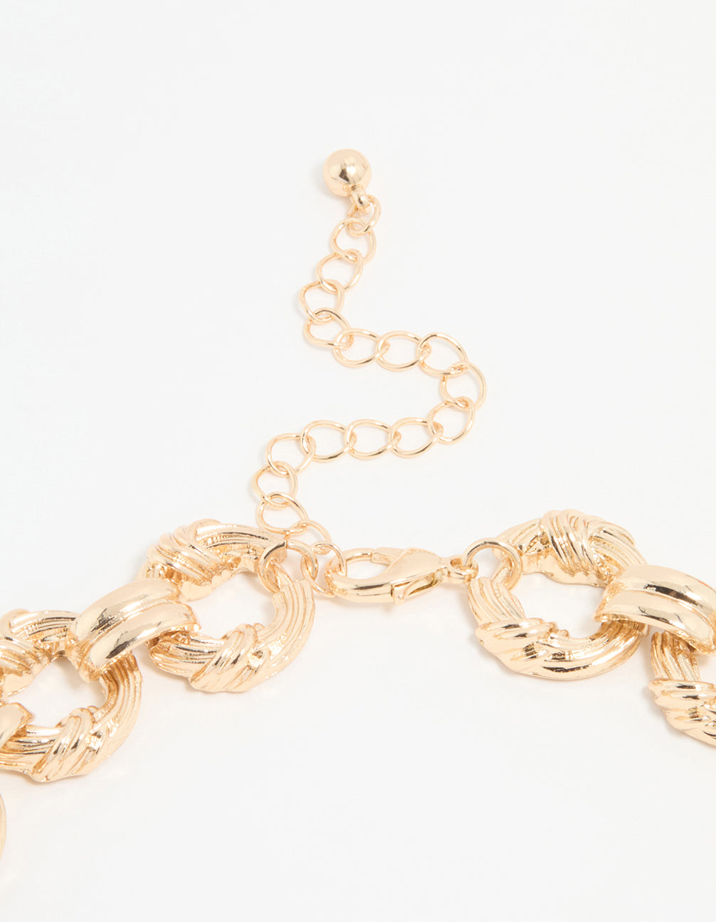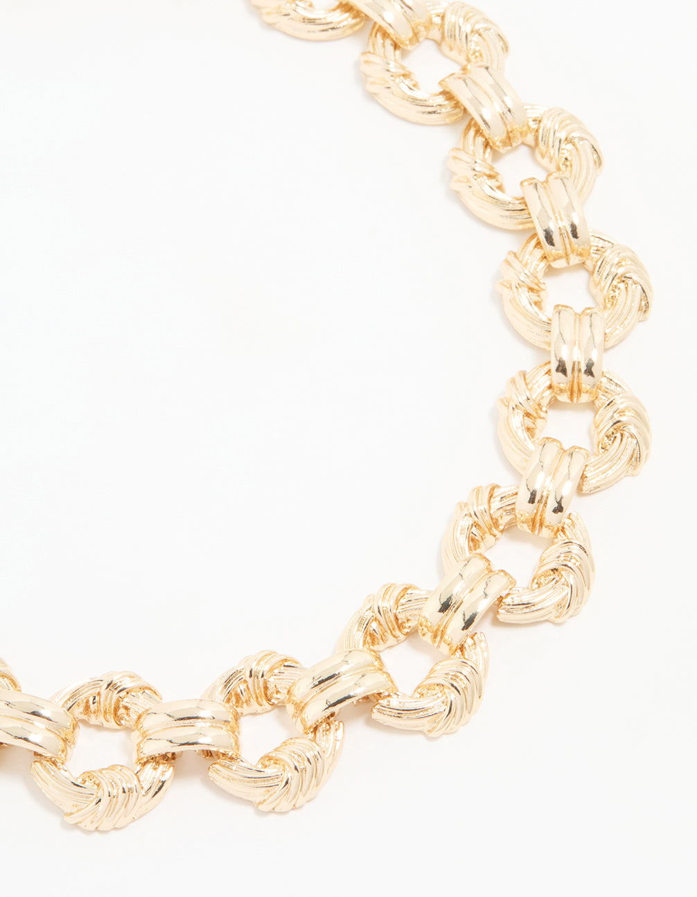 Turn heads with this Gold Ribbed Knotted Link Necklace, the ultimate statement piece for your jewellery collection! Featuring textured ribbed links and a chic knotted design, this necklace adds a modern twist to classic gold jewellery. Perfect for dressing up a casual outfit or completing an evening look, it's a versatile accessory you'll reach for again and again. Pair it with a crisp white shirt for effortless daytime glamour or layer it over a little black dress for a bold, fashion-forward edge. Whether you're heading to brunch, a party, or just want to elevate your everyday style, this gold statement necklace is your go-to for instant sophistication with a playful, youthful flair.