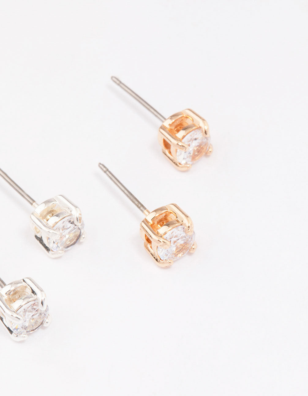 Add a touch of sparkle to your stack with these dazzling stud earrings. This earring pack includes two pairs of studs, one in a gold setting and the other in silver. Perfect for mixing your metals, or styling solo!