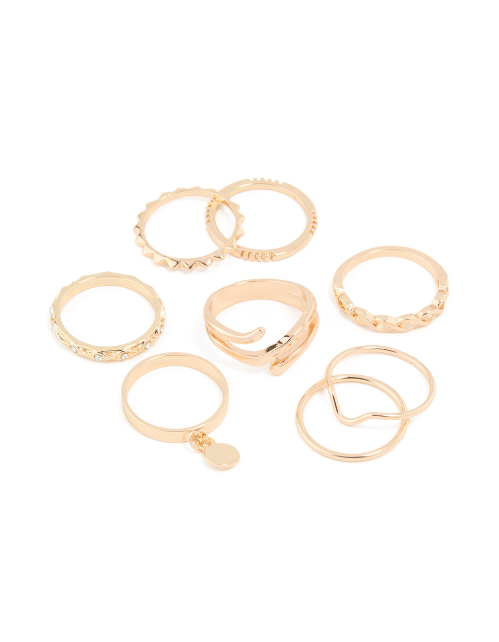 Level up your jewellery game with this Gold Swirl Mixed Stacking Rings Pack. This dreamy collection of stacking rings features a mix of delicate gold-toned designs, some with elegant swirl details, perfect for layering or wearing solo. Whether you're dressing up for a night out or adding a chic touch to your everyday look, these rings are endlessly versatile. Pair them with everything from casual jeans and a tee to your favourite party dress for a stylish, put-together vibe. Ideal for anyone who loves stackable jewellery, this set makes mixing and matching a breeze.