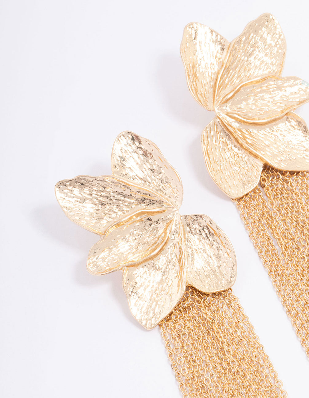 Add a hint of opulence to your look with these gorgeous, gold-toned drop earrings. These unique statement earrings feature a molten gold floral design, paired with strands of gold chains for a textural finish.