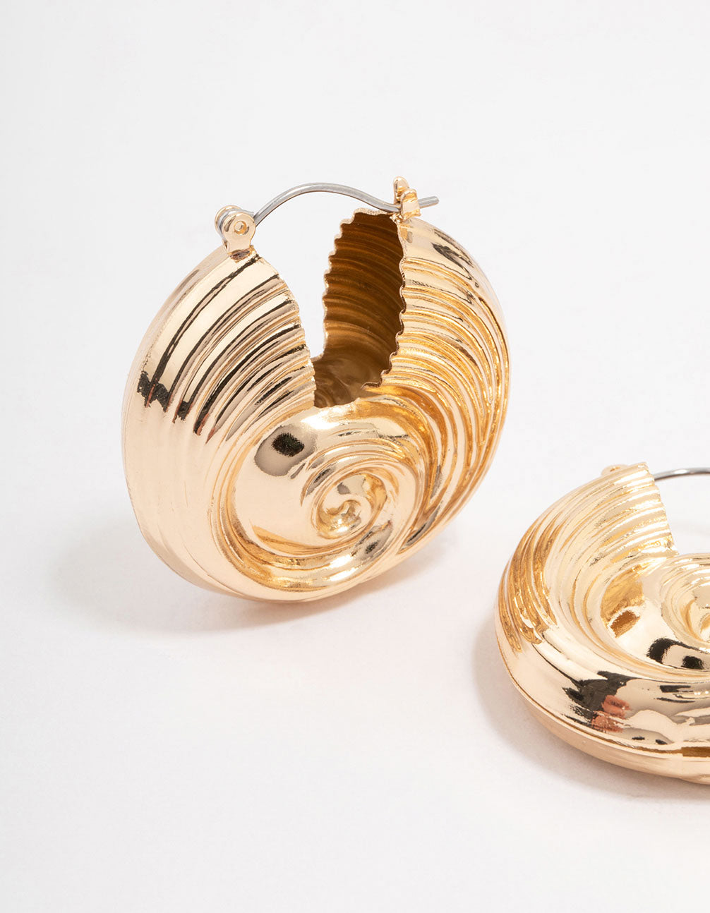 These unique hoop earrings feature a textured, fossil sea shell design.