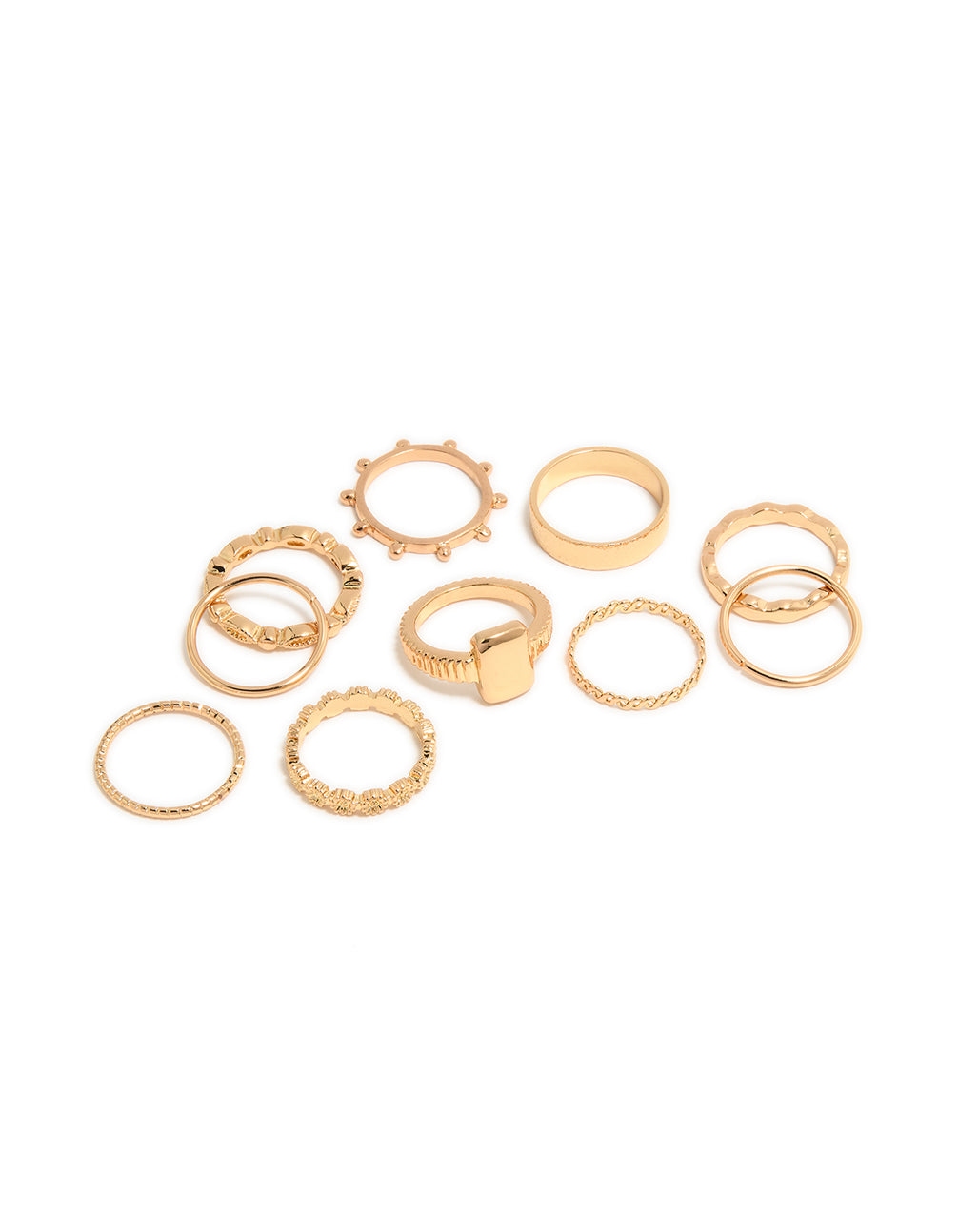 Stack your style sky-high with this Gold Textured Signet Rings Pack! This stunning ring pack features a mix of sleek, gold-toned designs and textured finishes, giving you endless ways to accessorise. Whether you're dressing up for a party or adding flair to your everyday look, these rings are versatile and chic. Perfect for pairing with casual jeans and a tee or elevating a little black dress, they're your go-to jewellery for any occasion. Wear them solo for a minimalist vibe or stack them all for a bold statement. A must-have for anyone who loves to mix and match their accessories!