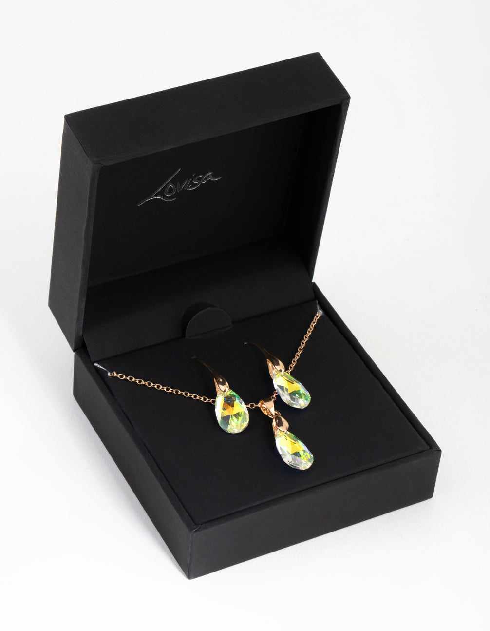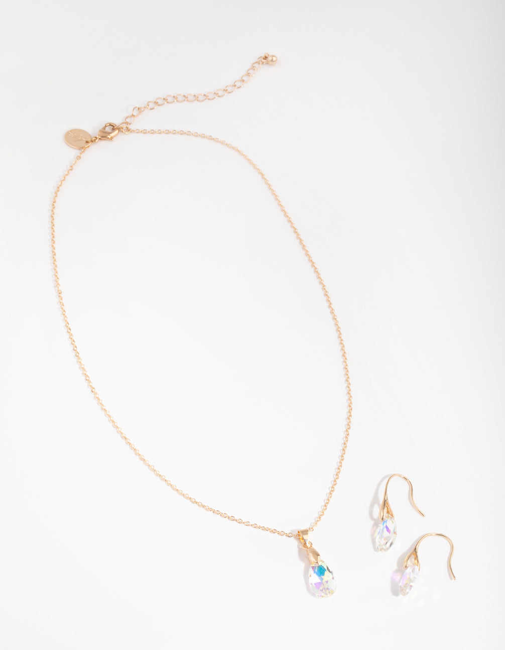 Dazzle and shine with eye-catching pieces that feature sparkling elements. This gorgeous necklace is gold toned, and it features a stunning, iridescent teardrop-cut stone that's faceted to ensure it catches the light! This necklace comes with a matching pair of earrings to complete the look. Give them to someone special or treat yourself!