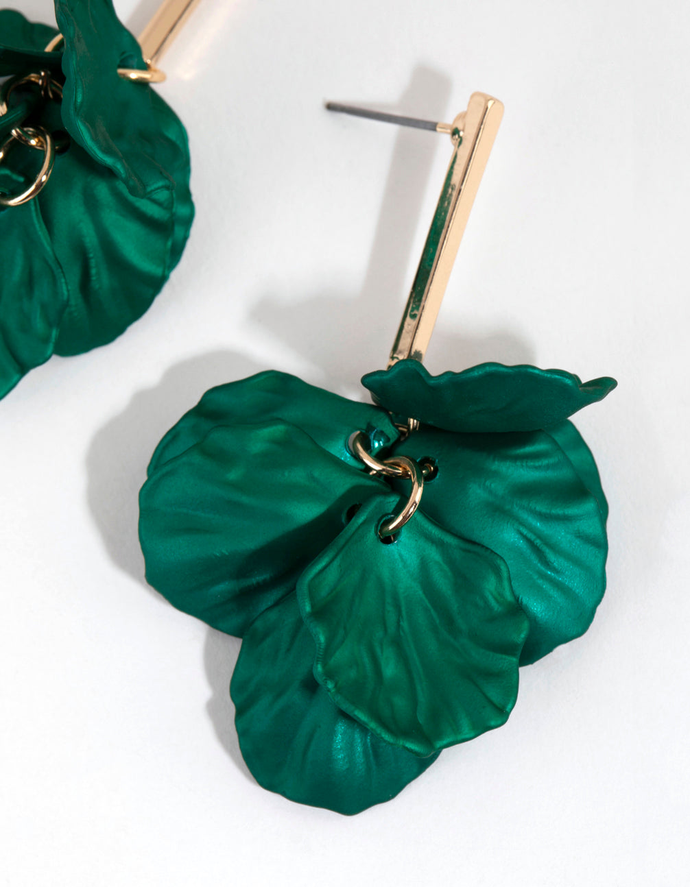 Keep things mysterious with dramatic jewellery that shines in an array of peacock tones. These beautiful gold-toned drop earrings boast a floral design in a vivid emerald green. The flowers petals are pearlised for extra shine.