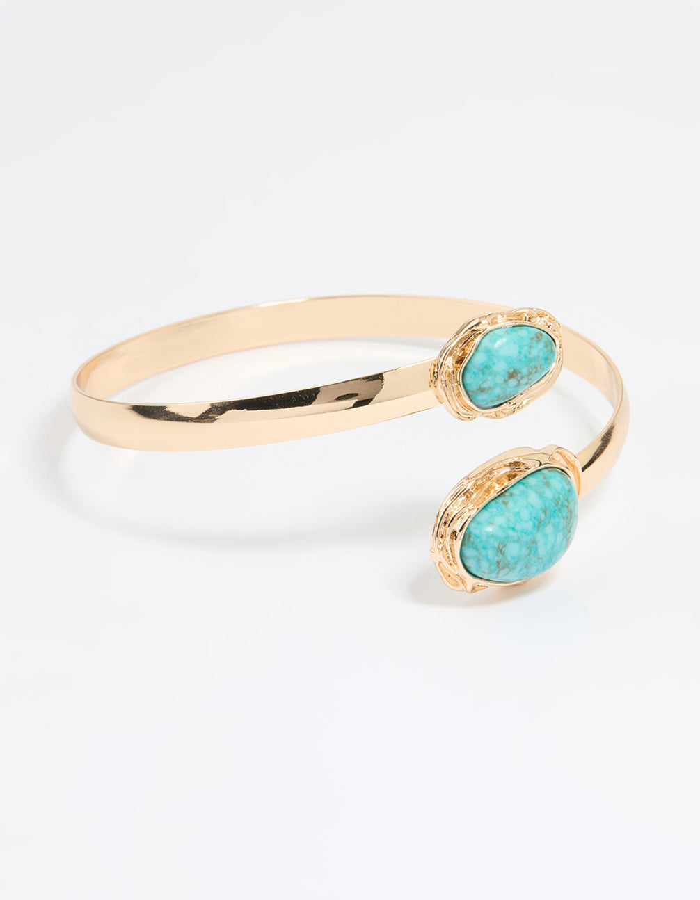 Add a touch of boho elegance to your look with this Gold Turquoise Stone Arm Cuff. This arm cuff features a smooth gold-tone finish paired with a vibrant turquoise-coloured stone that brings a pop of colour and charm. Perfect for festivals, beach outings, or rooftop evenings, this arm cuff wraps beautifully around your arm, making it a bold yet effortless accessory. Whether you're dressing up a maxi dress, going chic with a sleeveless top, or adding flair to a casual playsuit, this cuff is versatile enough to complement a variety of outfits. Ideal for jewellery lovers seeking unique arm accessories, this turquoise-adorned cuff makes a standout addition to any collection.