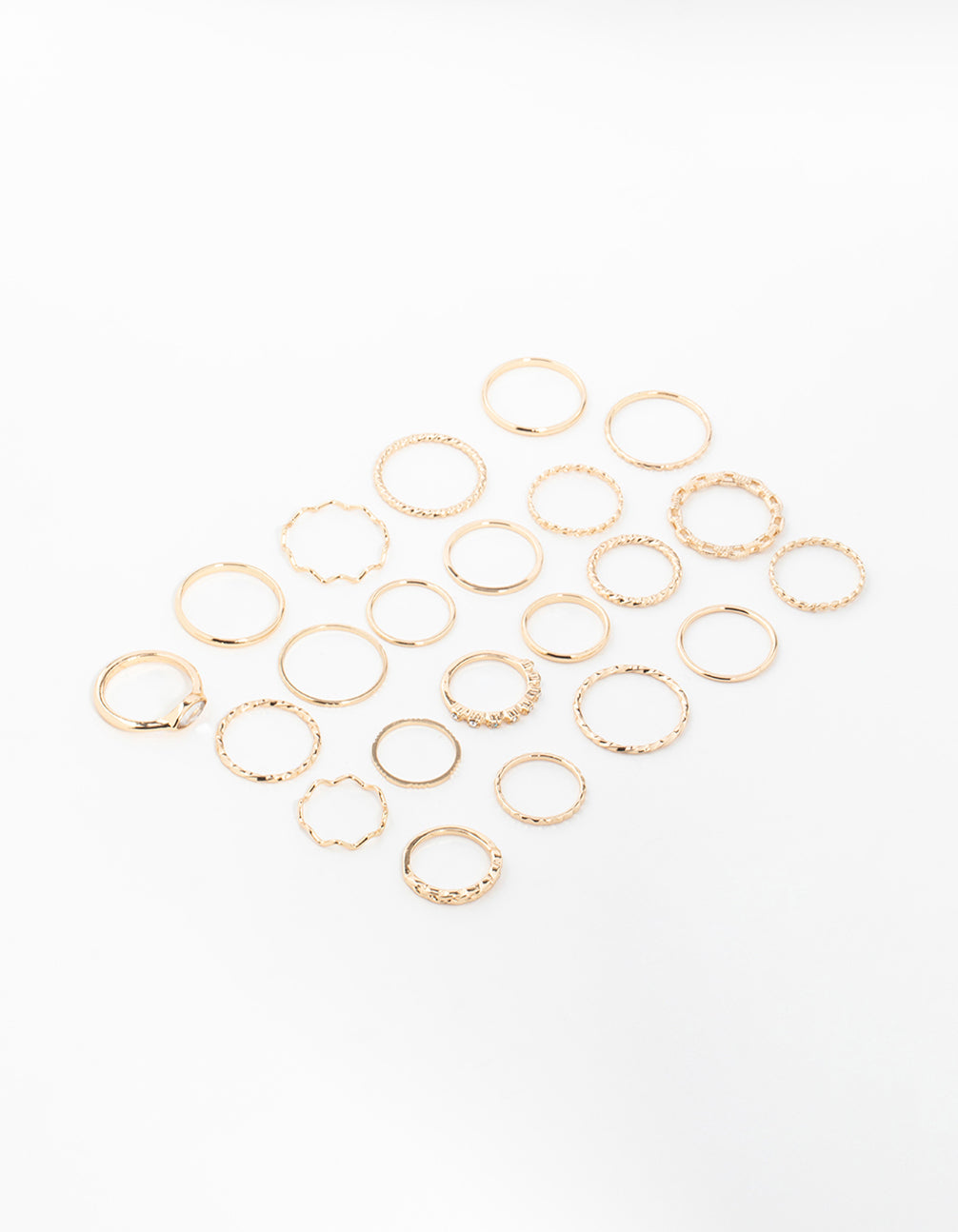 Create the ultimate ring stack with this gorgeous gold toned ring set. This set features 22 rings in sleek, twisted, diamante accent and swirly designs, so you can create a unique and fun ring stack.