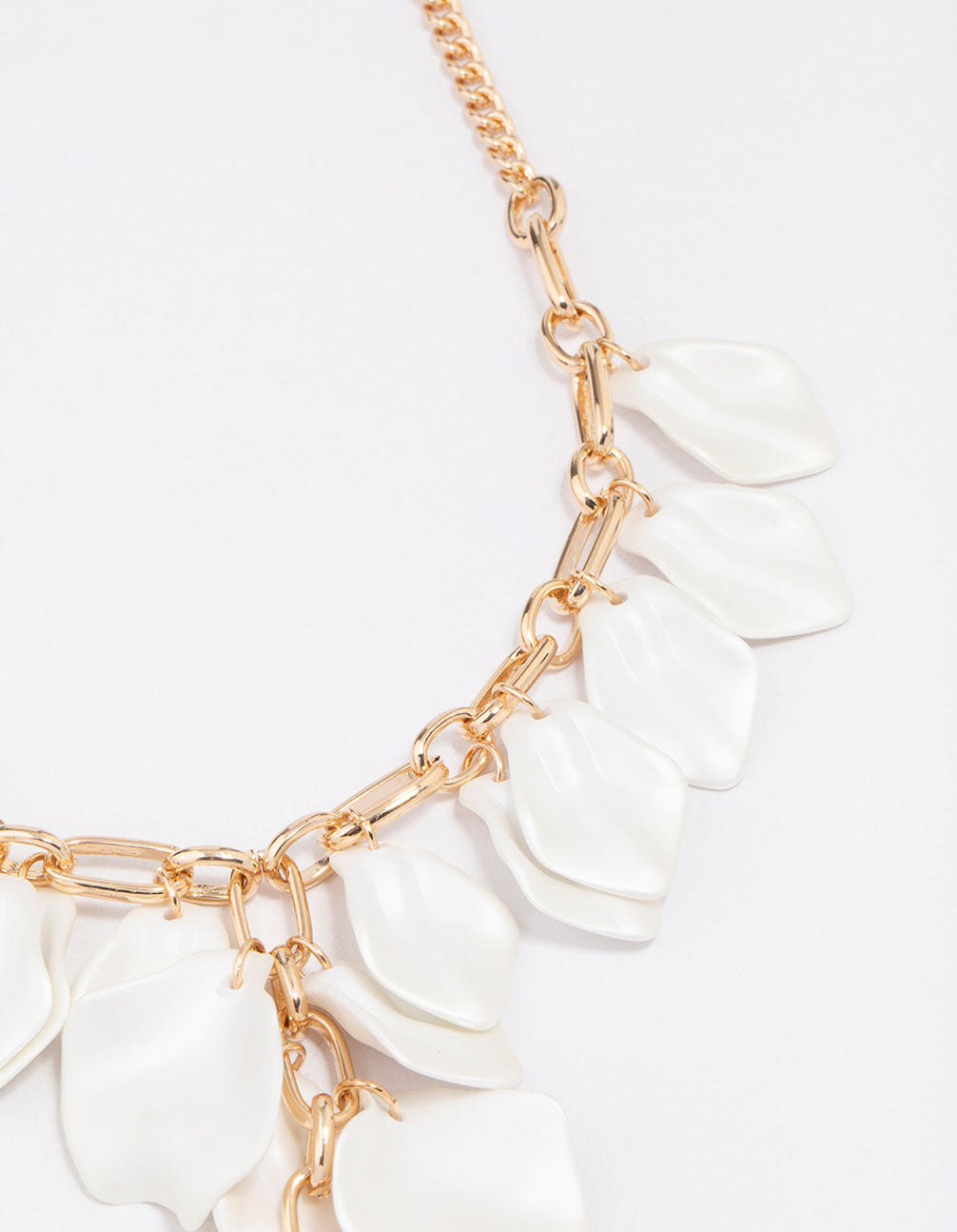 Elevate your evening look with this stunning, gold-toned statement necklace. This necklace features a collection of iridescent flower petals, perfect for adding a delicate touch to your look.
