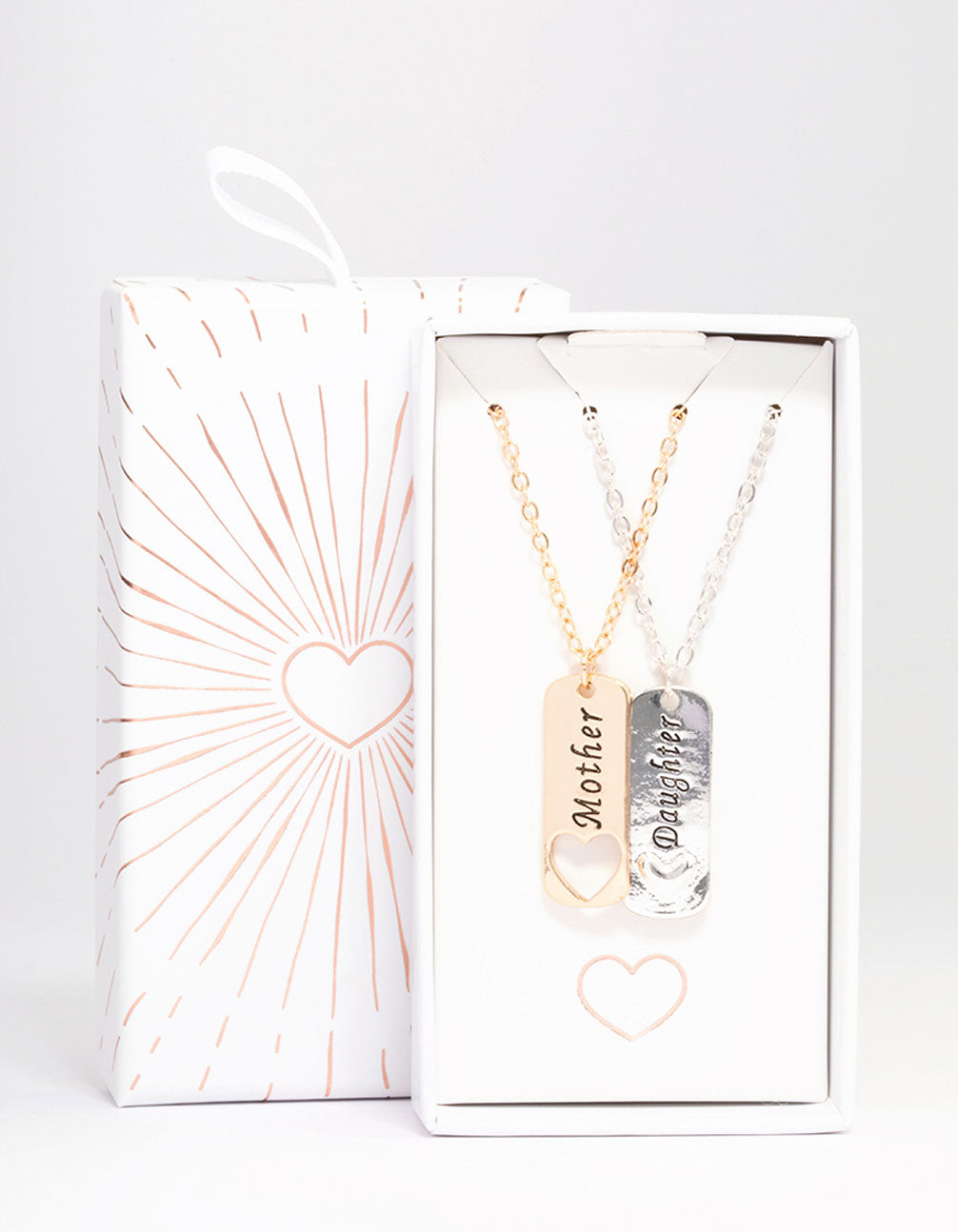 This gift box contains two individual pendant necklaces adorned with gold and silver mother and daughter charms.