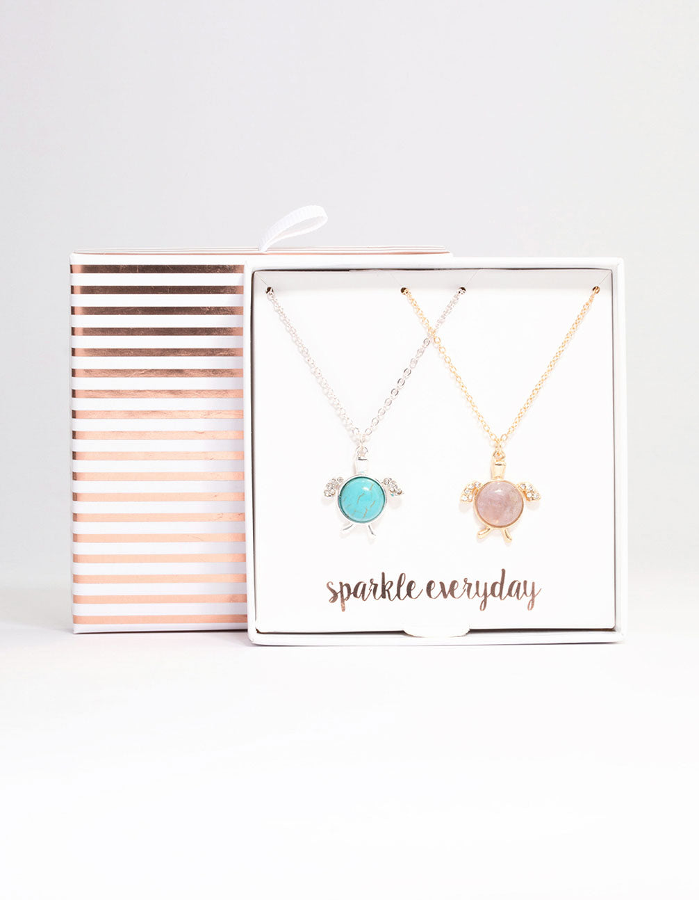 This gift box contains two pendant necklaces with semi-precious turtle pendants for a unique finish.