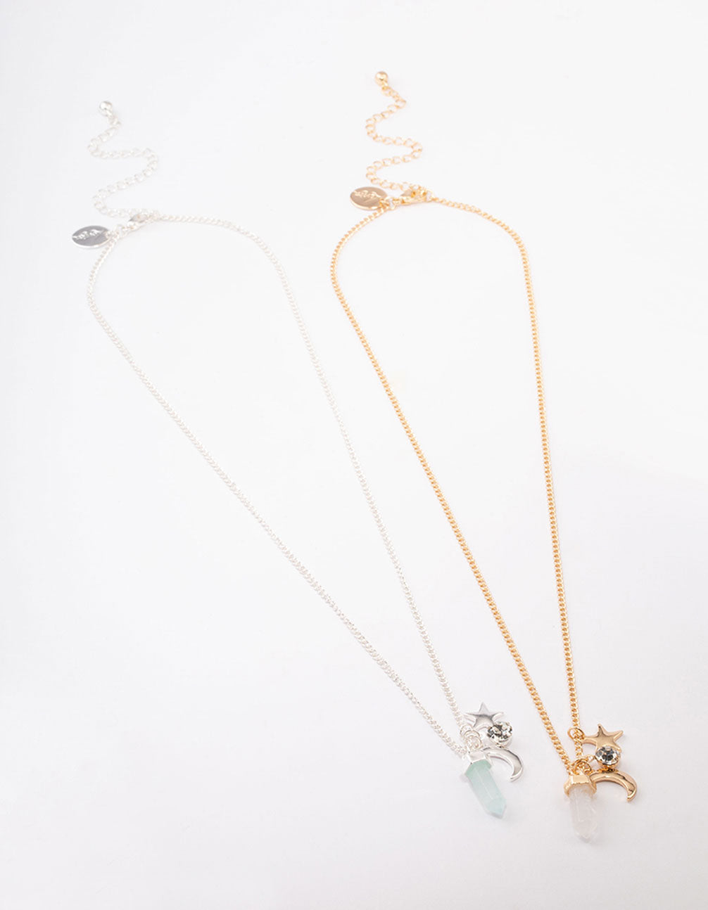 This gift box contains two individual pendant necklaces adorned with semi-precious stones and celestial charms.