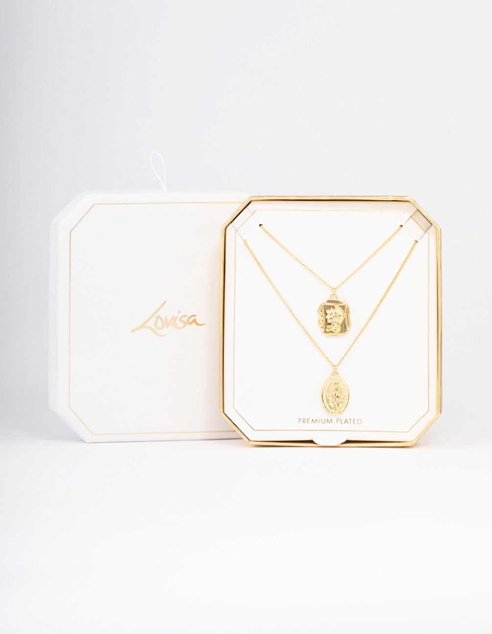 - This gift box contains two gold plated pendant necklaces adorned with ornate oval and square pendants for a classic look.