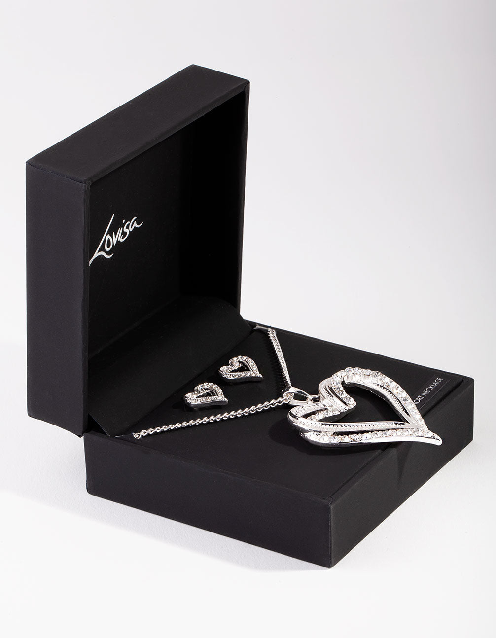 We heart this earring and necklace pack! Features a silver-toned long statement heart necklace and small studs with diamante features.