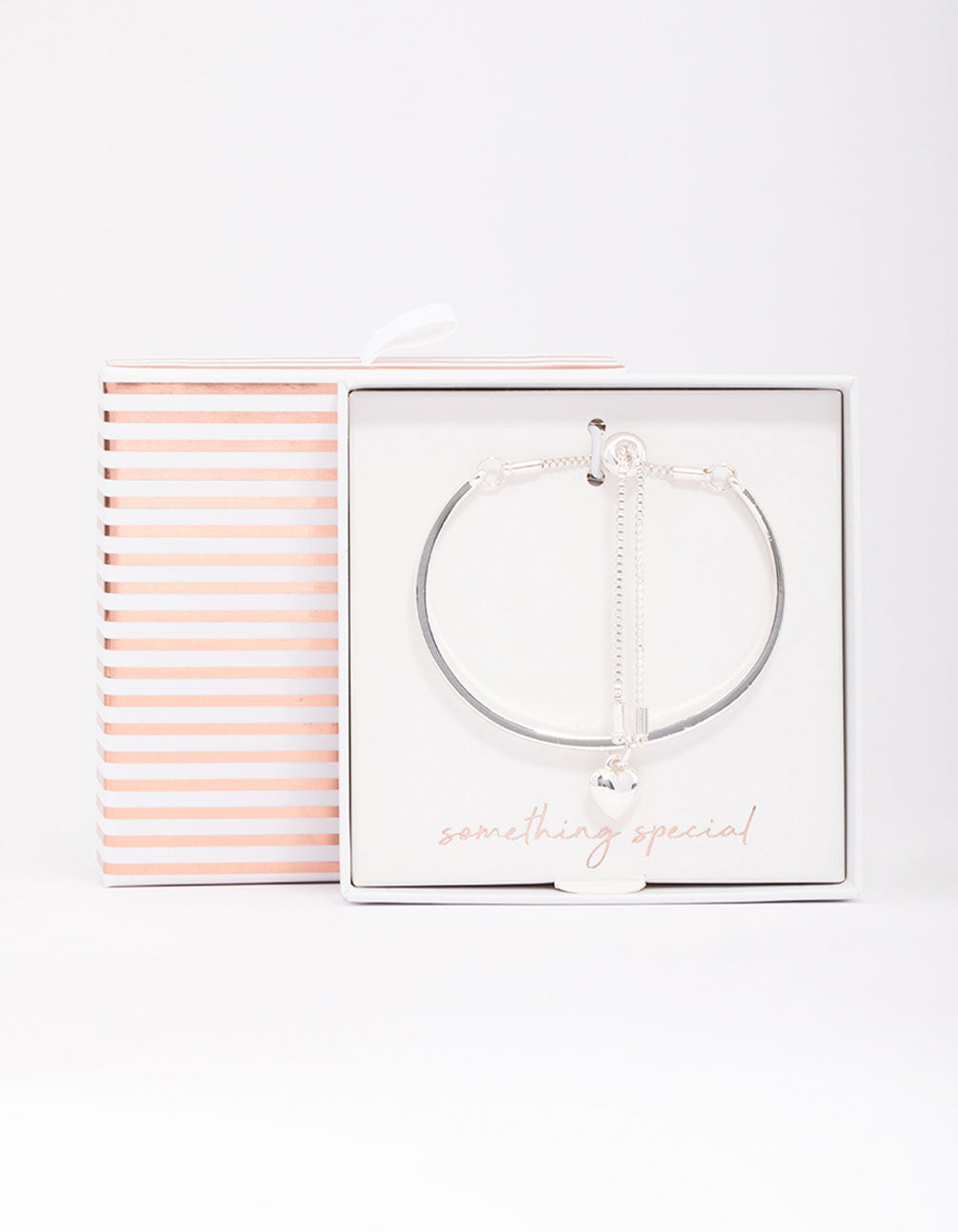 This gift box contains a simple silver toggle bracelet adorned with a solid heart charm for a lovable look.