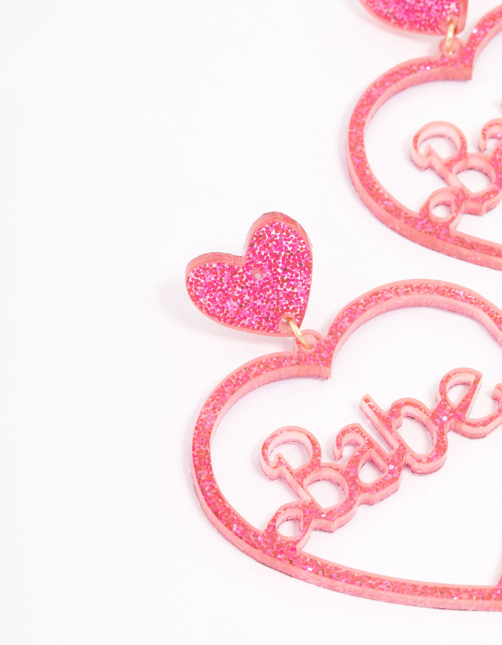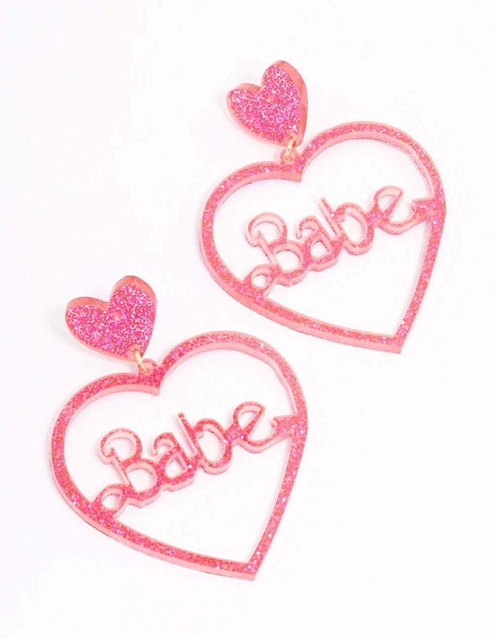 Channel your inner Barbie with these sparkly statement earrings. These drop earrings are designed with a sparkly pink acrylic and feature a heart-shaped design with the word 'Babe' in a script font. Style these all year round for a pop of pink to your look, or style them at your next Barbie-themed costume party.