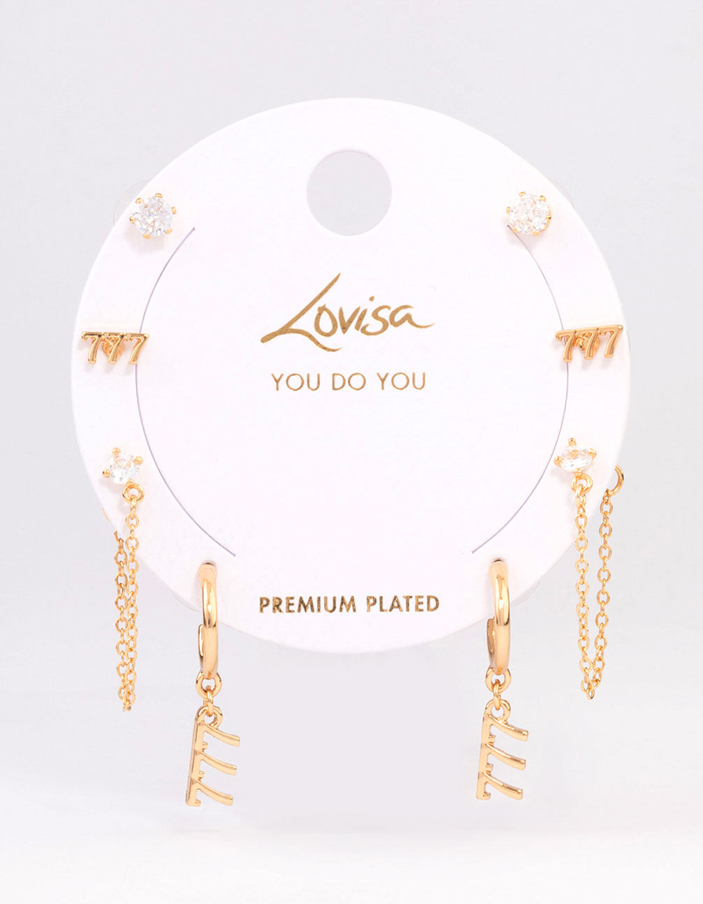 - This curated earring stud pack is plated with real gold and features dainty '777' angel number designs for a personalised finish to your look. Repetitions of 7 are a symbol of luck!