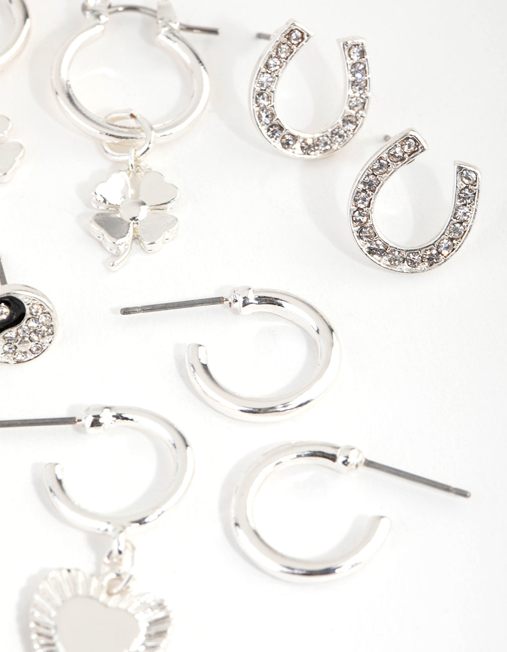 Mix them, match them, stack them! This set comes with six pairs of earrings with a variety of motifs and designs. Designs include a lucky diamante-encrusted horseshoe and a four-leaf clover.