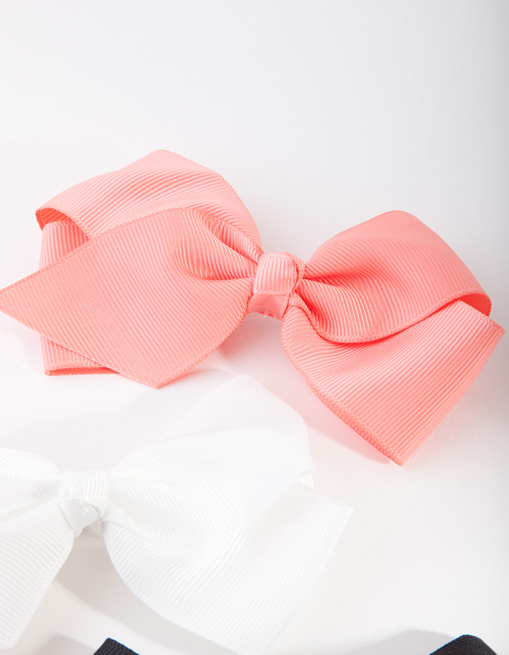 This range is perfect for young fashionistas. This small ribbon bow hair clip pack features pink, white and black fabric designs making it the perfect kids accessory and/or gift.