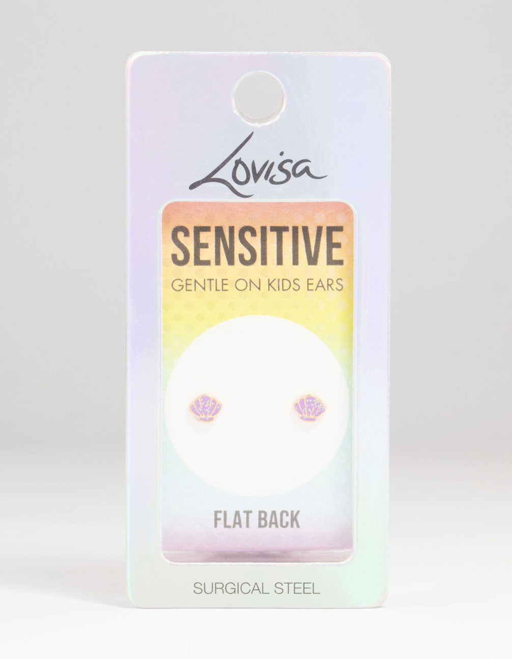 Make a splash with these Kids Gold Plated Surgical Steel Shell Flat Back Earrings! Perfect for kids with sensitive ears, these shell-shaped flat back studs are hypoallergenic and waterproof and perfect for bringing beach vibes to their look.