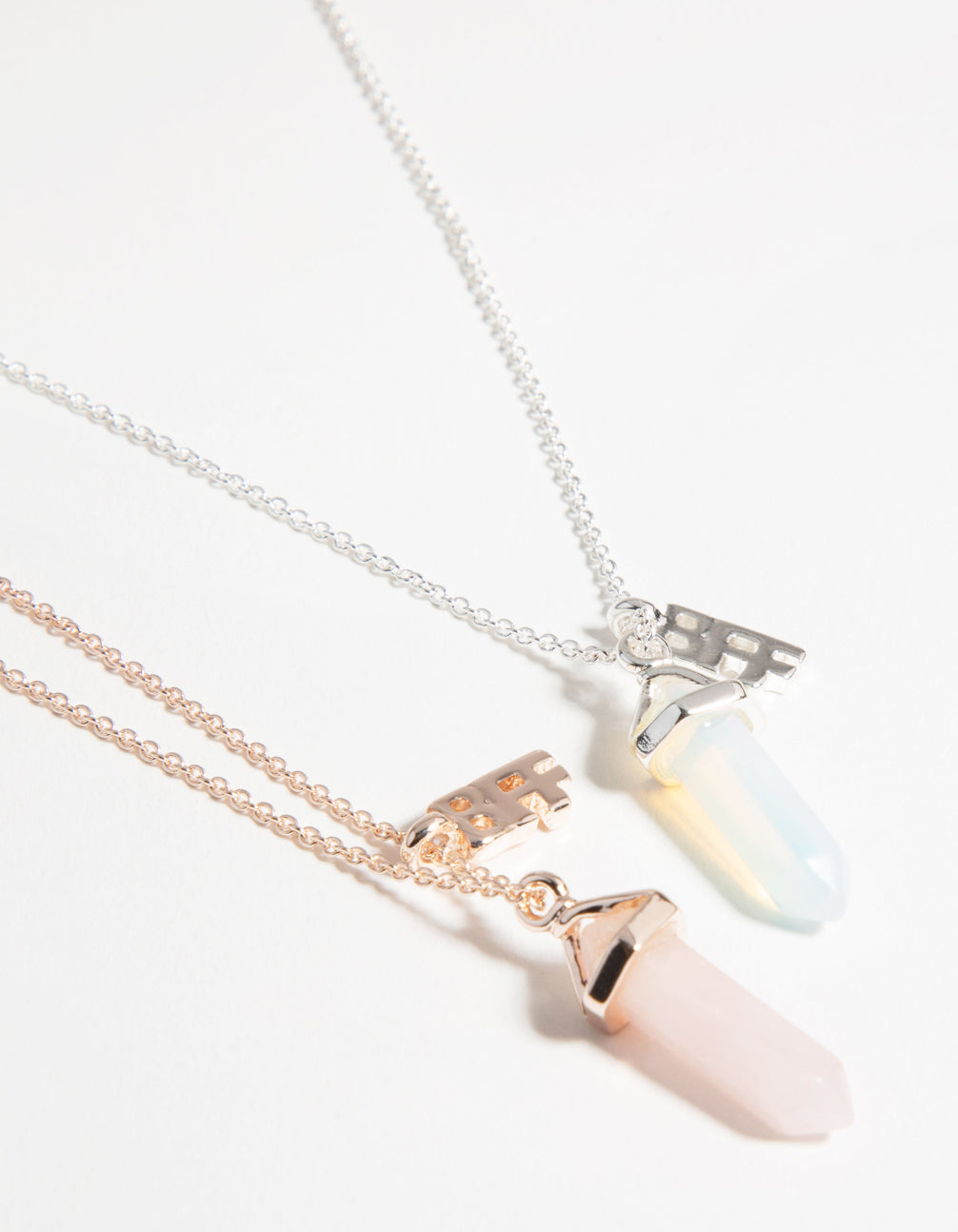Lovisa KidsÕ Collection is perfect for little ones with big imaginations. This necklace set is meant for two besties. It comes with two necklaces, one in a silver tone with a milky stone and the other in a rose-gold tone with a pink-hued stone. Both necklaces have a hanging BFF pendant for two peas in a pod!