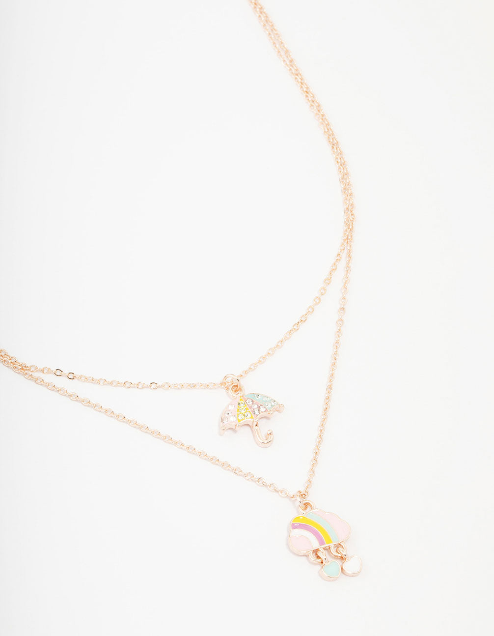 This rose gold necklace features an enamel rain cloud and umbrella charms, perfect for adding personality to their look!