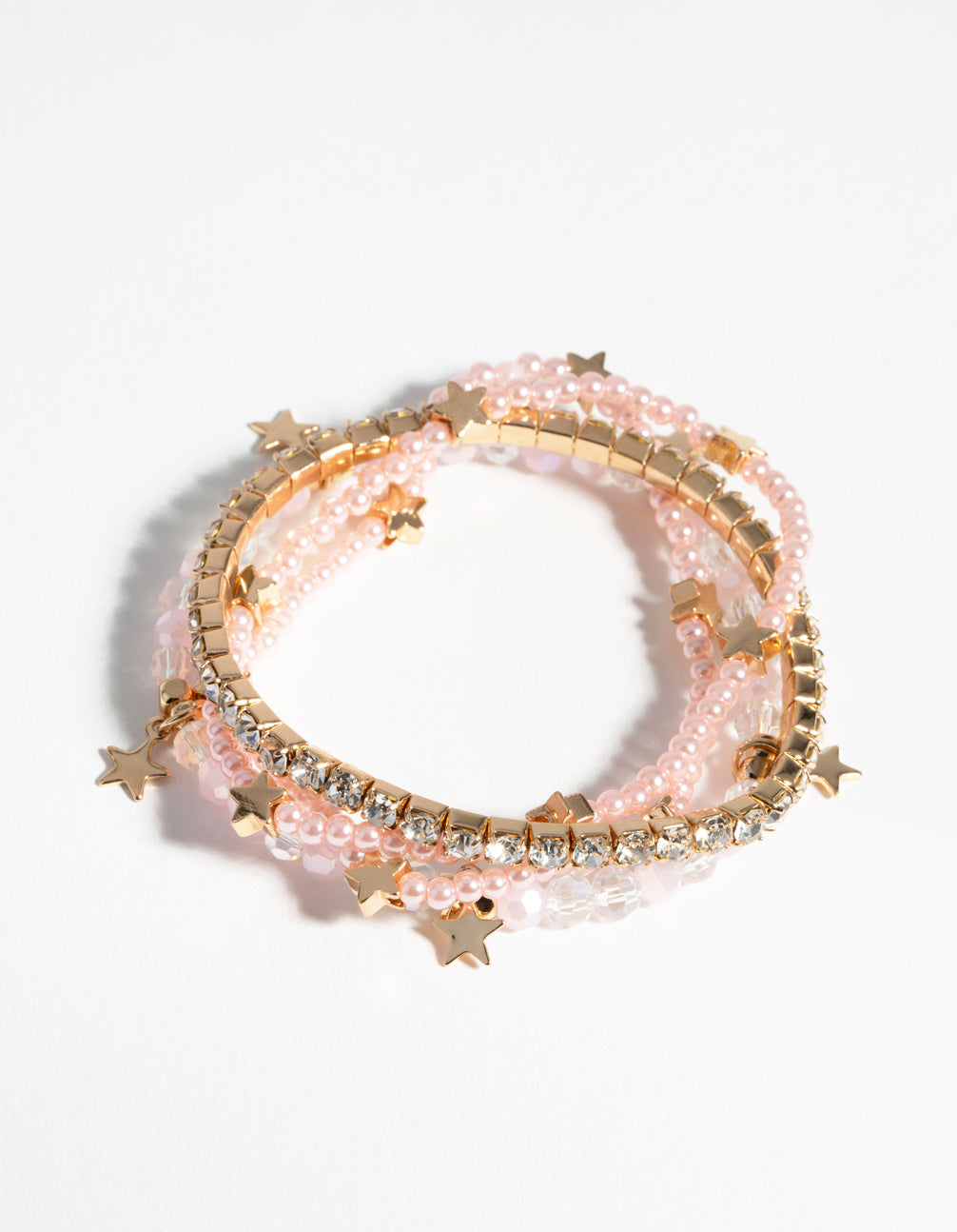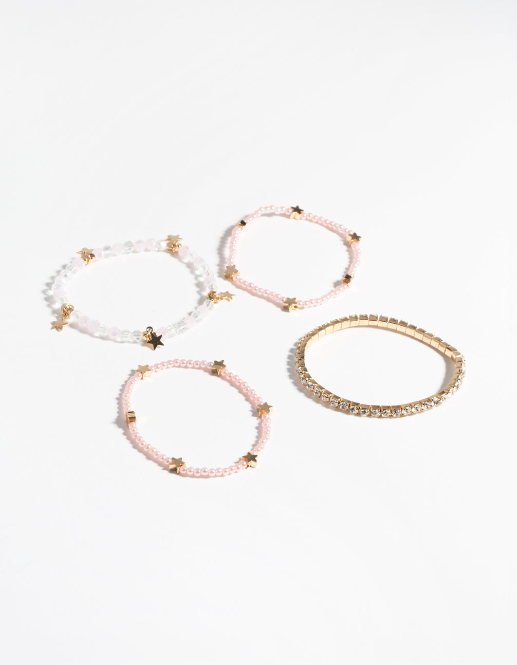 Pink pearls, diamantes and stars are everything! This kids bracelet 4-pack includes two pearl and star styles, one gold-toned diamante style and one beaded star charm style. Wear alone or as a dramatic stack!
