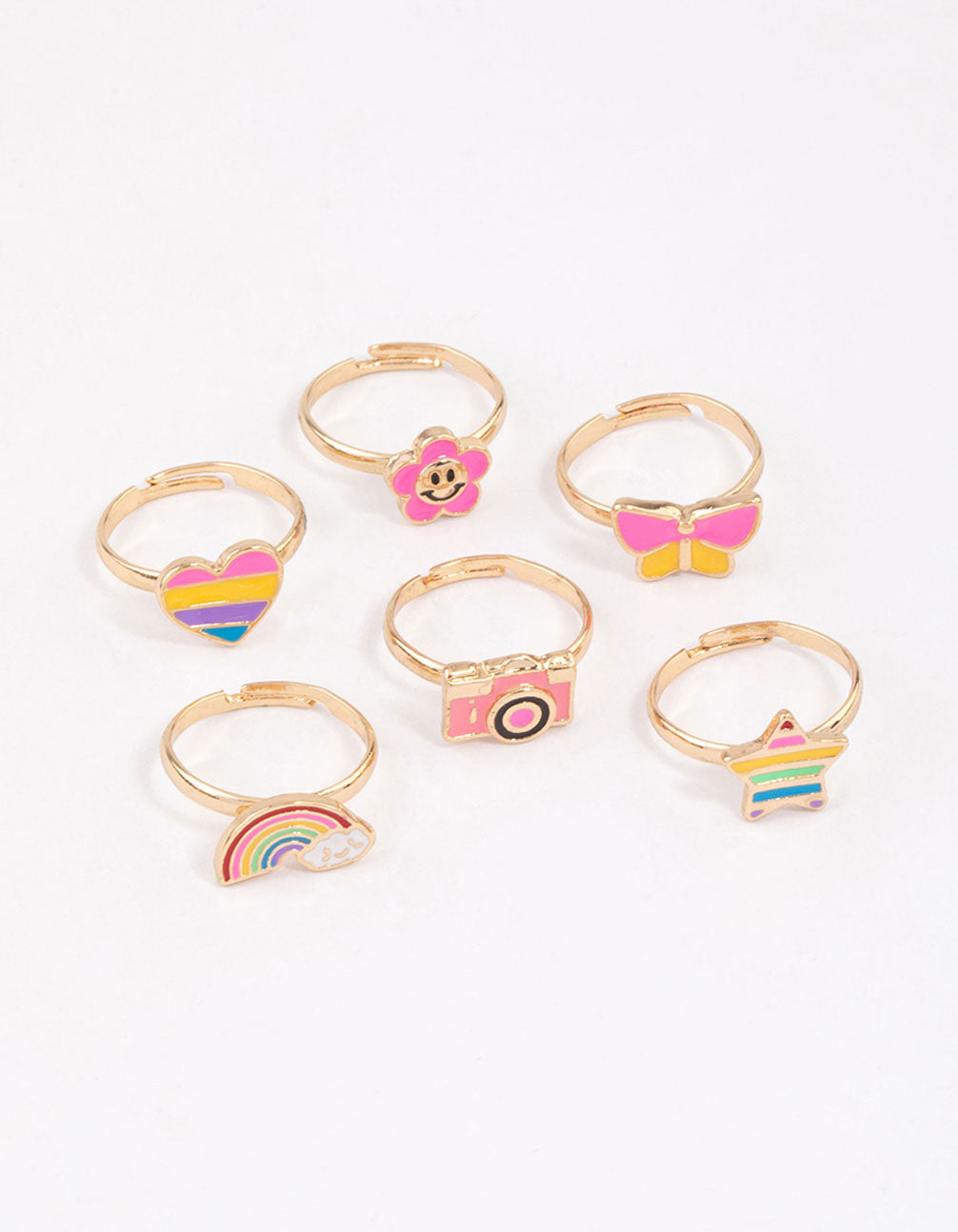 • This ring pack contains six, adjustable stacking rings with a collection of rainbow accents for a colourful and playful look.
