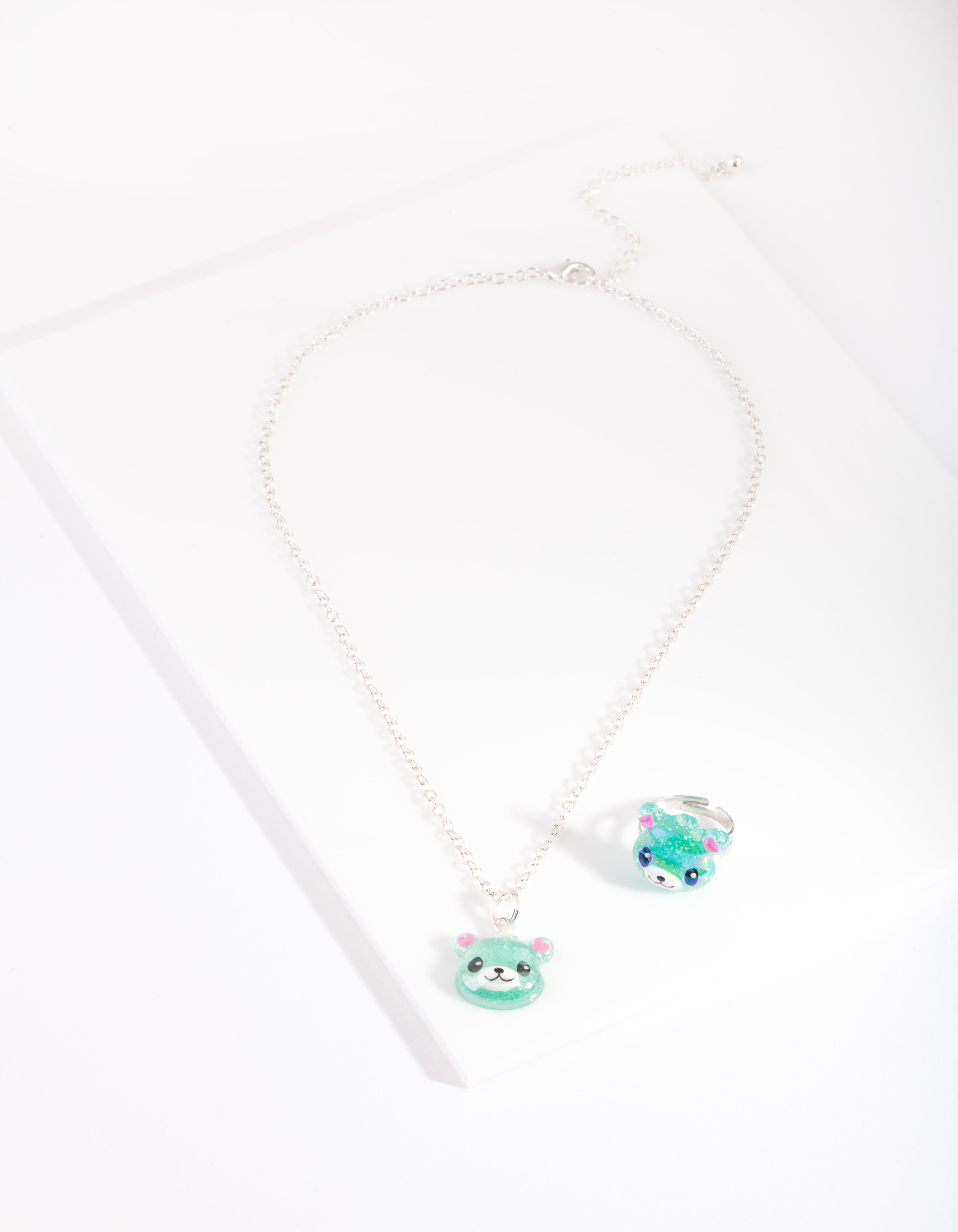 This fun kids set includes silver-tone necklace and ring featuring a green glittery panda pendant on each.