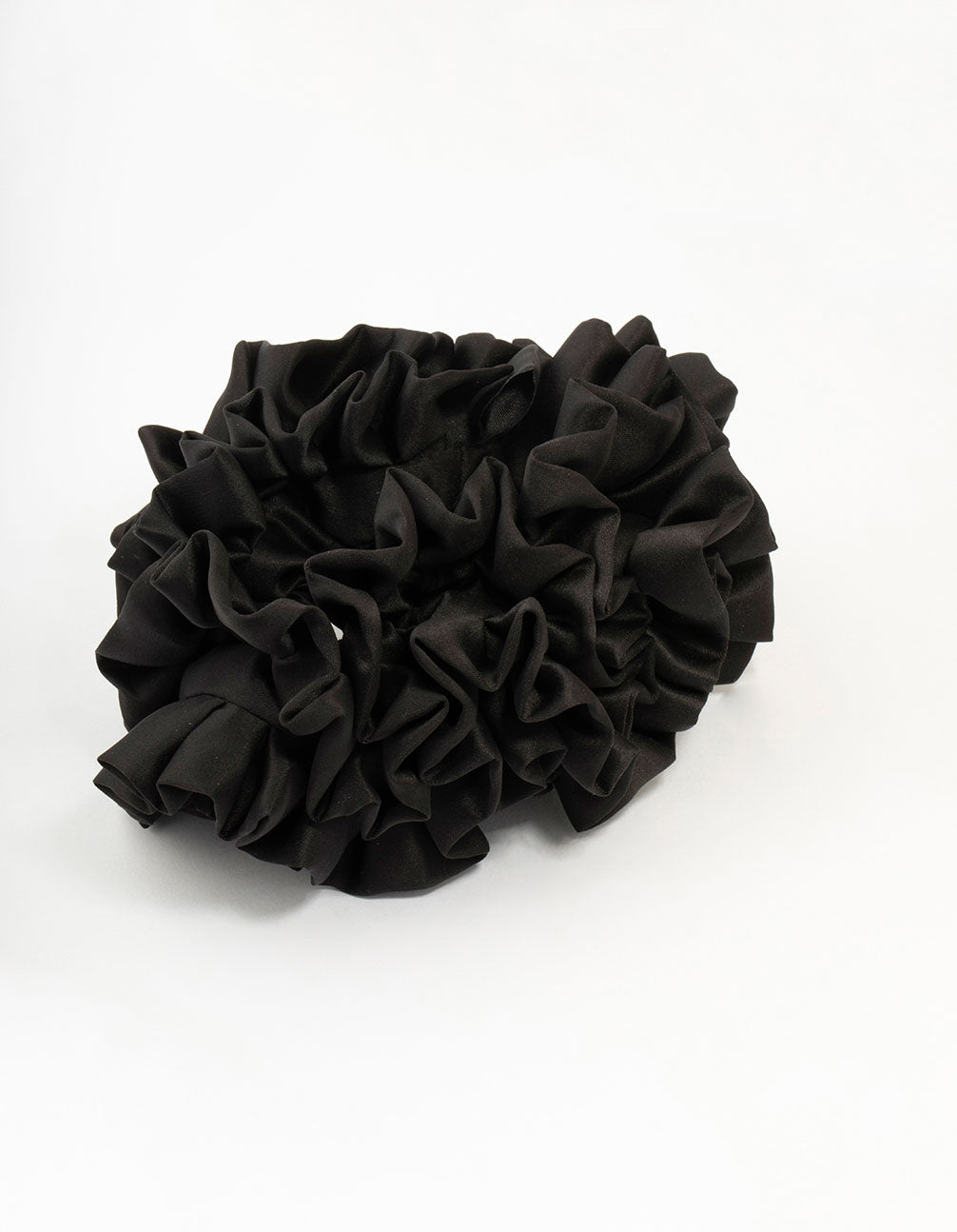 Tame your tresses with this chic scrunchie. Made from black ruffle fabric, it adds a touch of minimal glam and visual interest to your hair. Perfect for a stylish and effortless look.