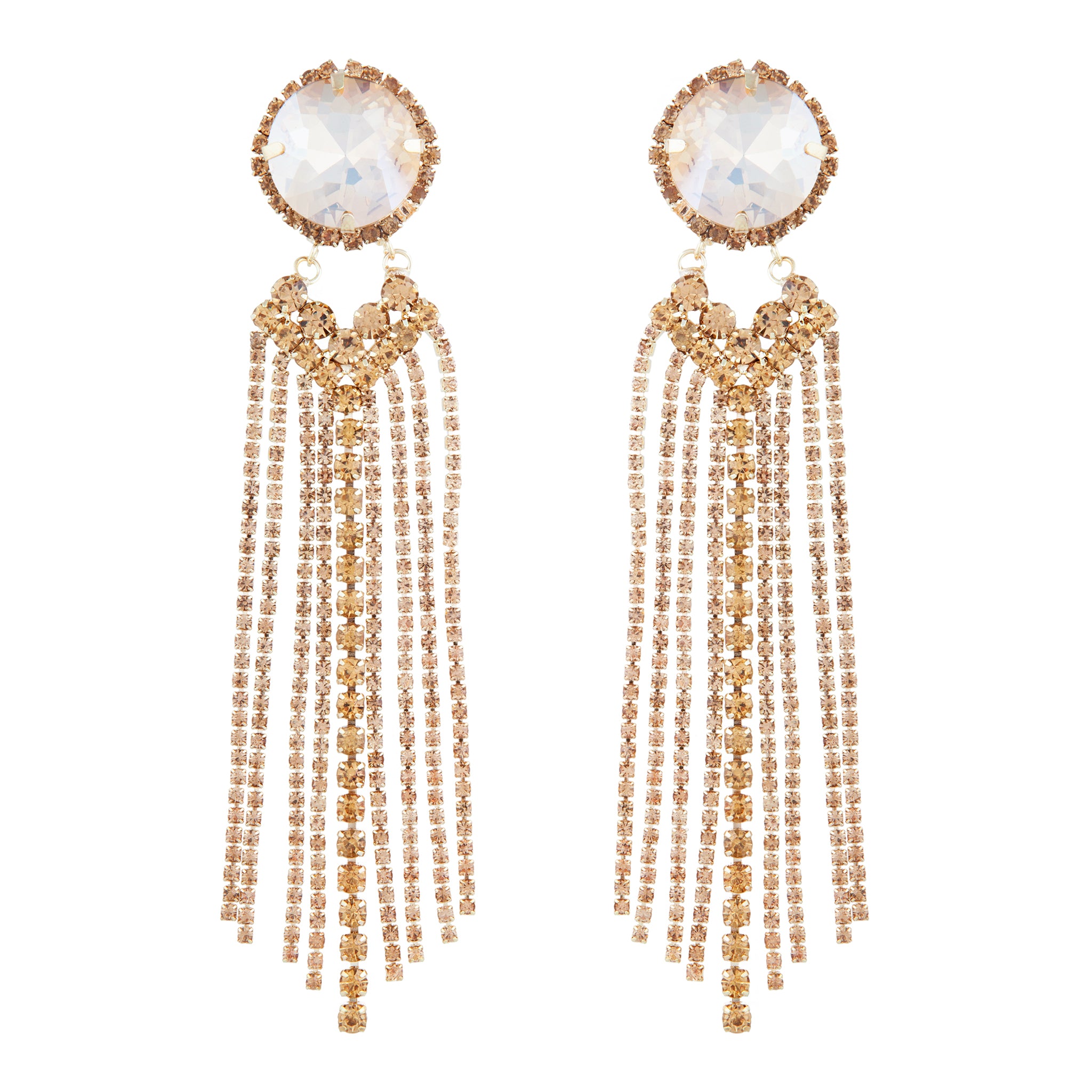Large Glass Stone With Gold Diamante Tassels Earrings
