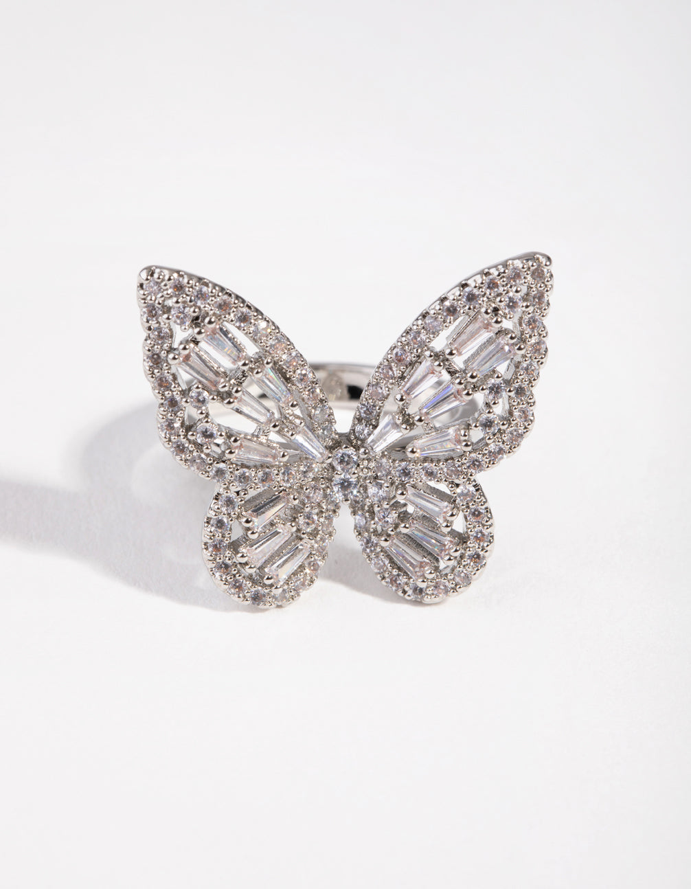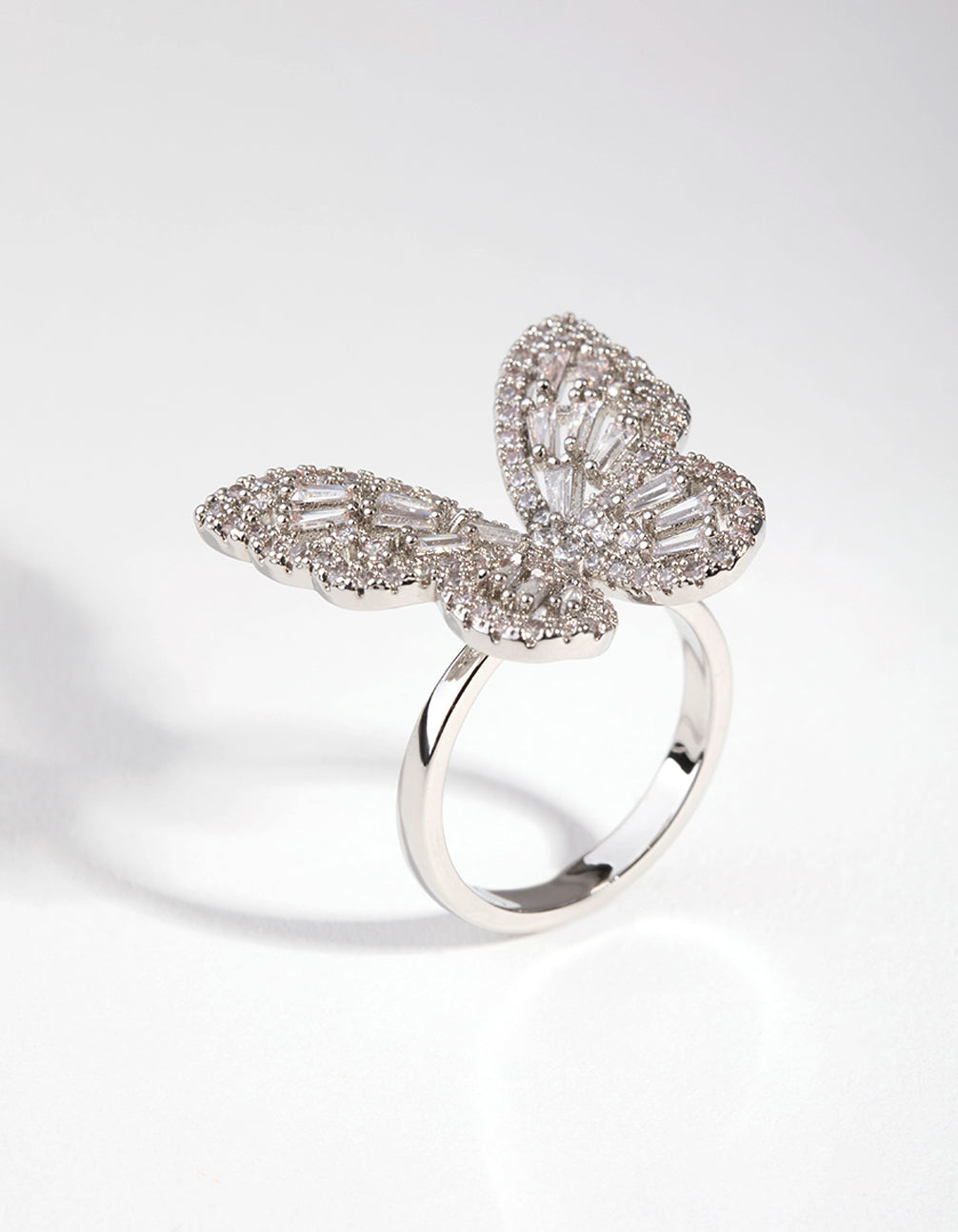 Dazzle and shine with eye-catching pieces featuring sparkling elements. This stunning silver-toned ring is shaped like a butterfly, and it features diamond simulant stones, which sparkle with the clarity and brilliance of a true diamond. This piece comes with an elegant black Lovisa box. Gift it to someone special or treat yourself!