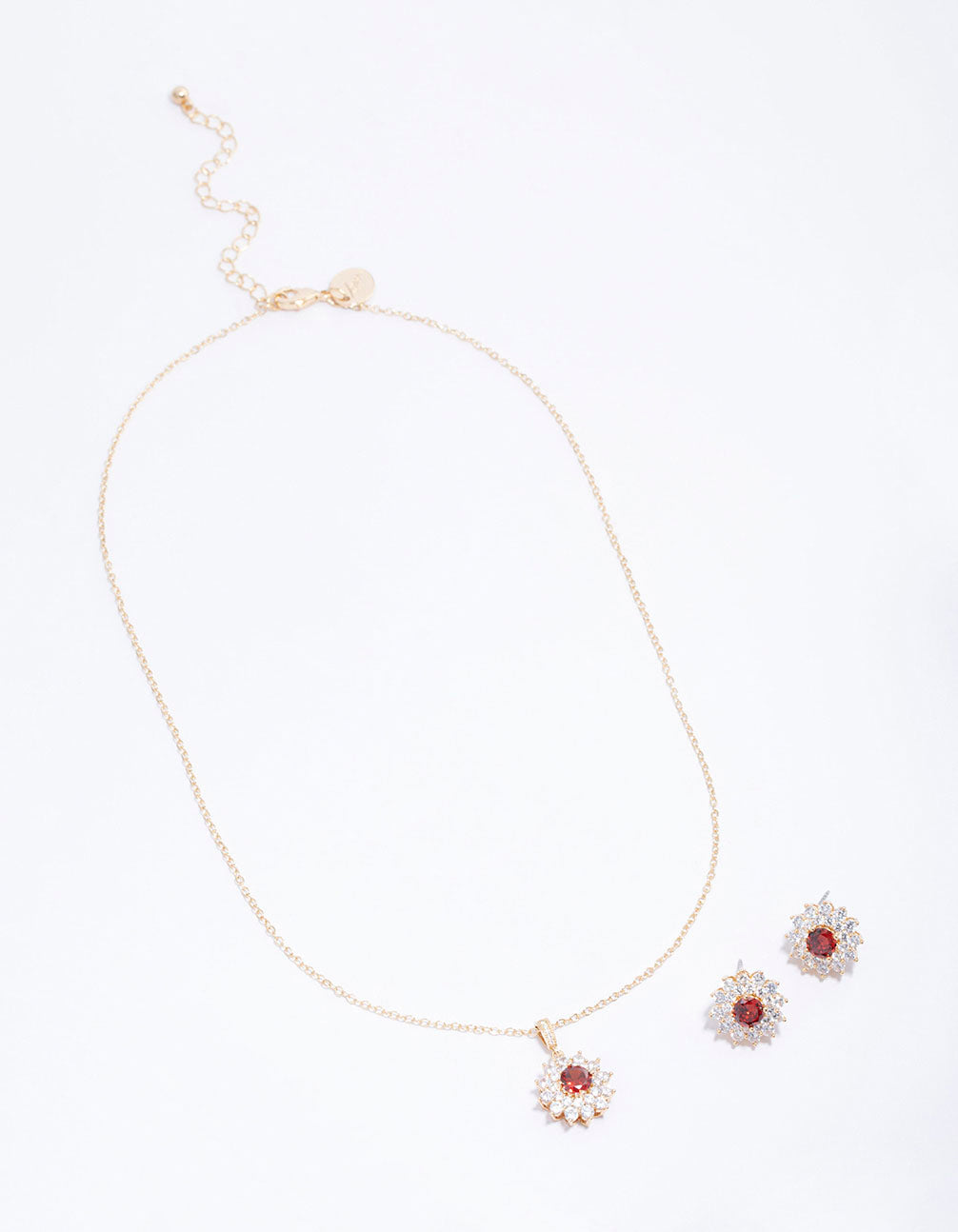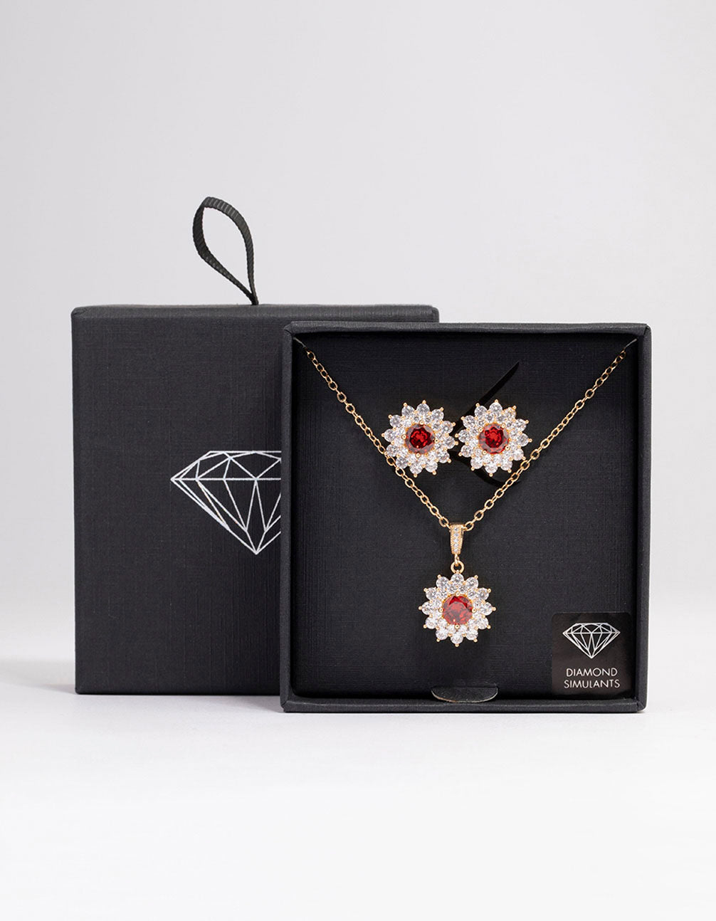 - This elegant jewellery set contains a gorgeous pair of ruby floral studs and adorning pendant necklace to match.