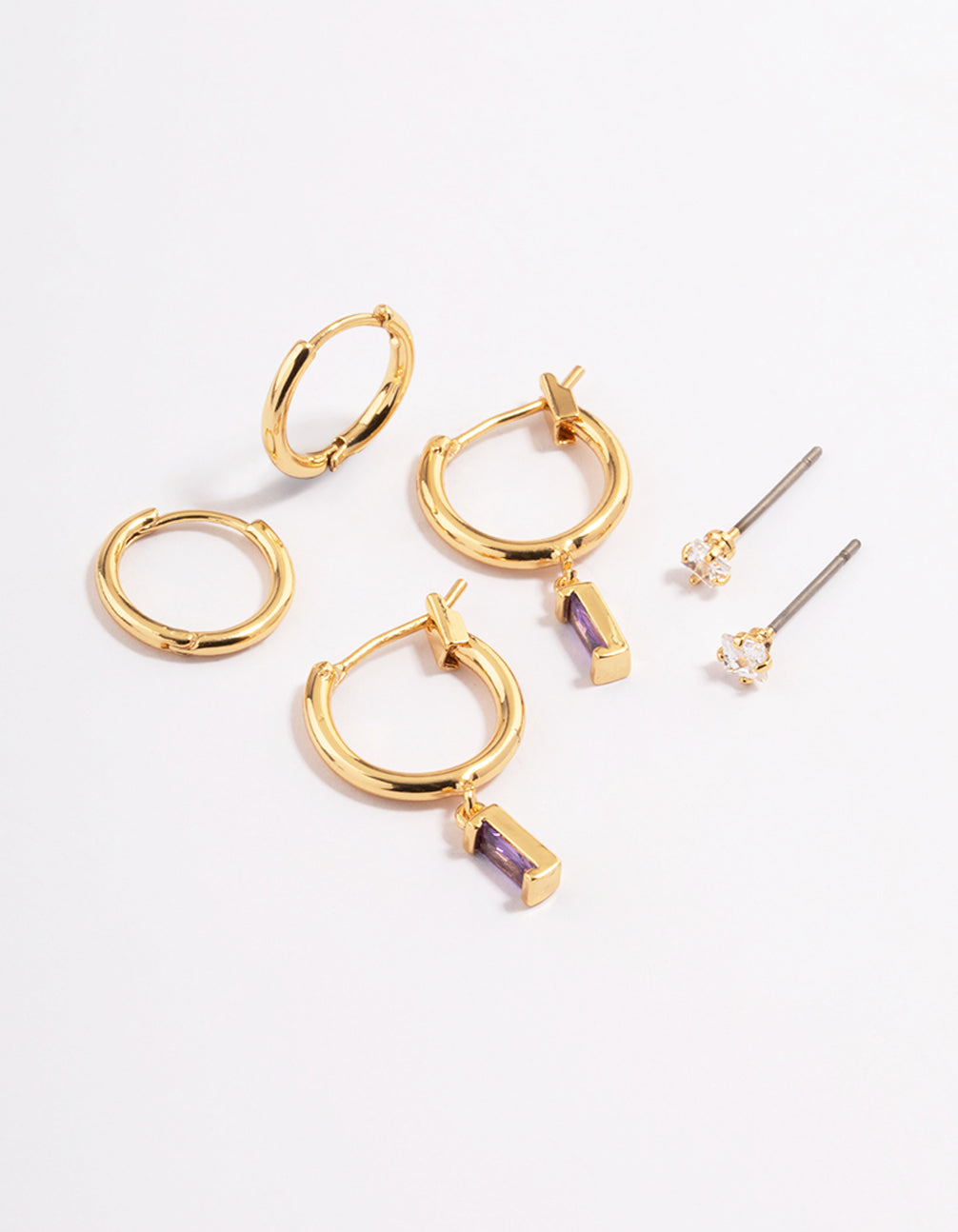 Gold Plated Brass Cubic Zirconia Amethyst Cut Huggie Earrings 6-Pack