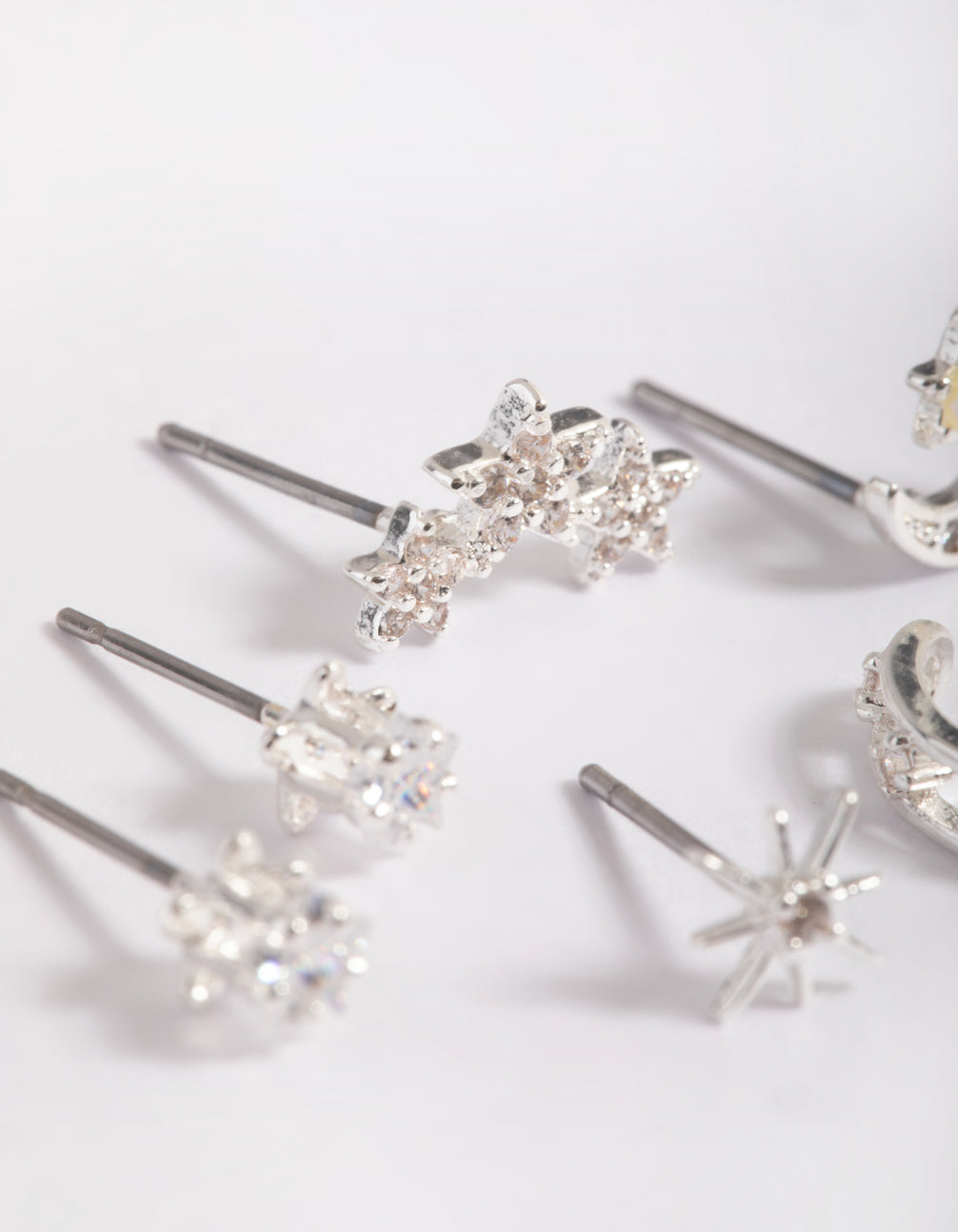 Silver Plated Cubic Zirconia Celestial Stud Earrings 6-Pack