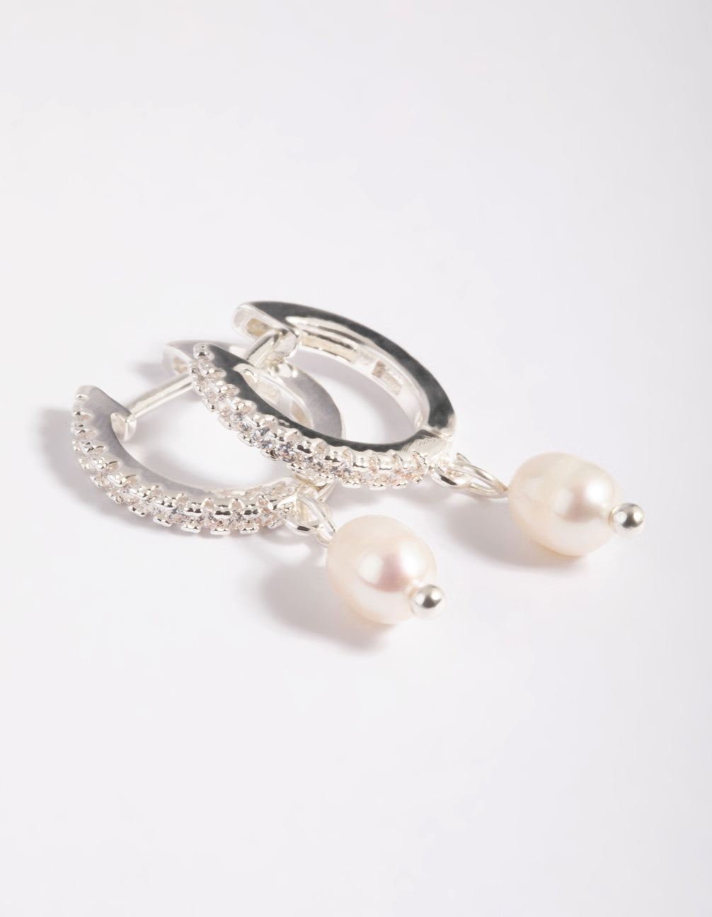 Silver Plated Brass Cubic Zirconia Pearl Huggie Hoop Earrings