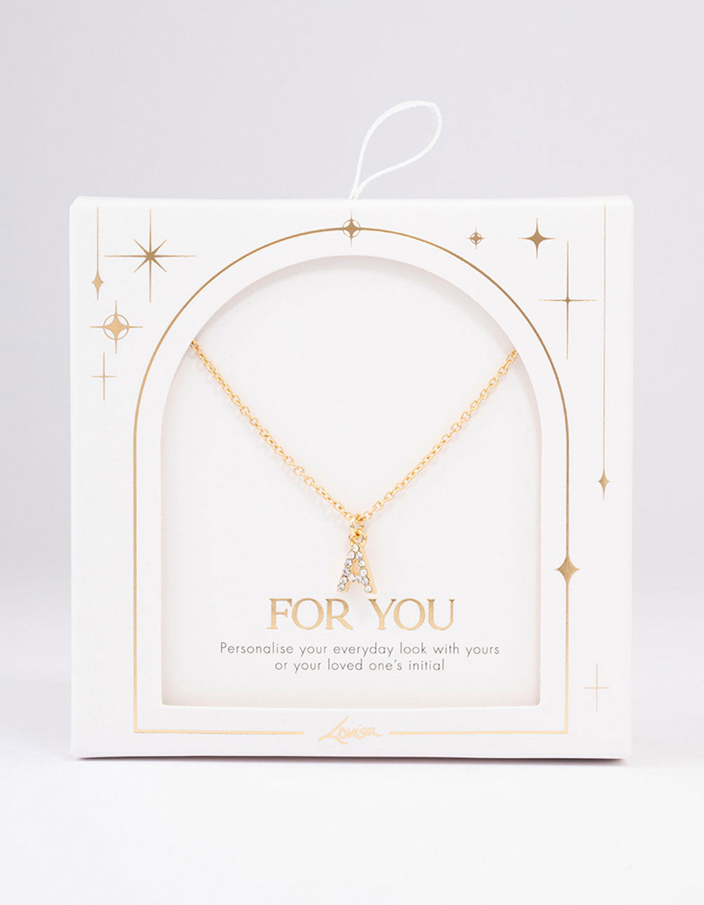 This gift box contains a gold plated pendant necklace with a diamante-encrusted A letter pendant.