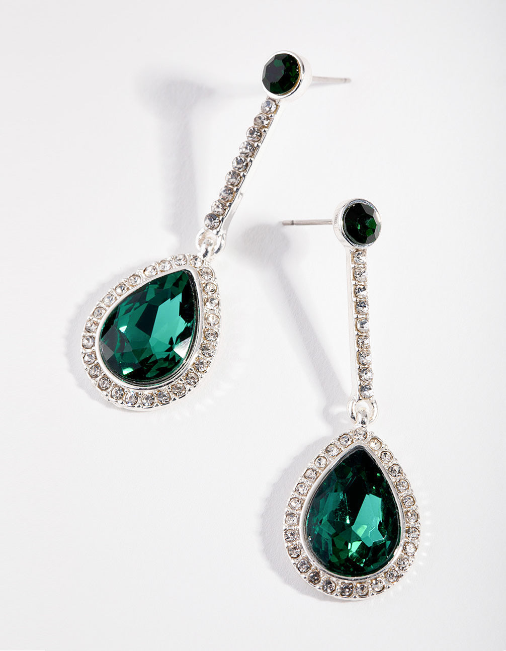 Add a pop of colour to your outfit with a fun pair of earrings! These gorgeous silver-toned earrings feature emerald-coloured stones, surrounded by glittering diamantes. Give your outfit a touch of luxe!
